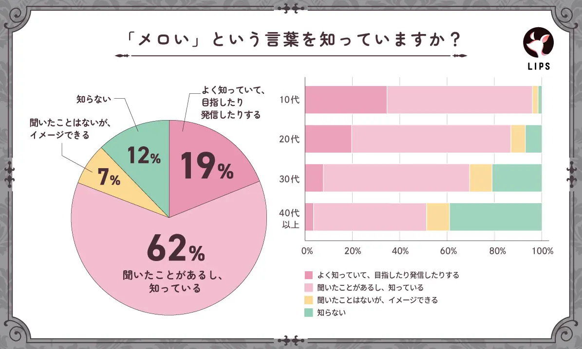 全体の8割以上のユーザーが「メロい」という言葉を認知していることが判明。なかでも約2割のユーザーが、「メロい女メイク」などのコンテンツを自身のメイクの参考にするなど、若年層を中心に非常にポジティブに捉えられているトレンドであることがわかりました。