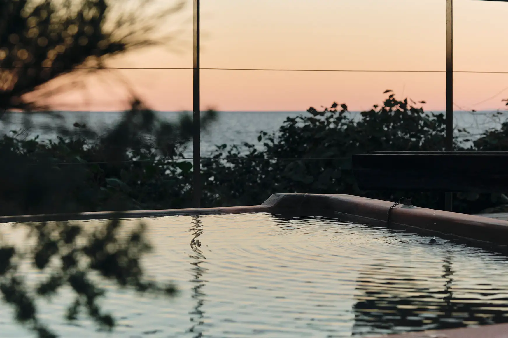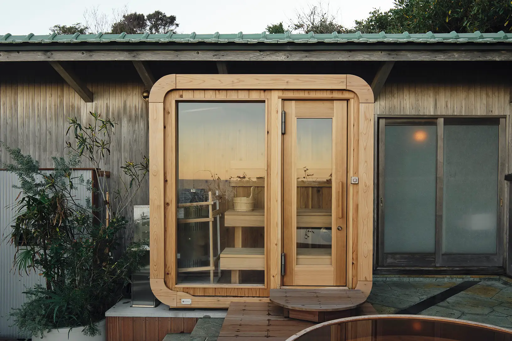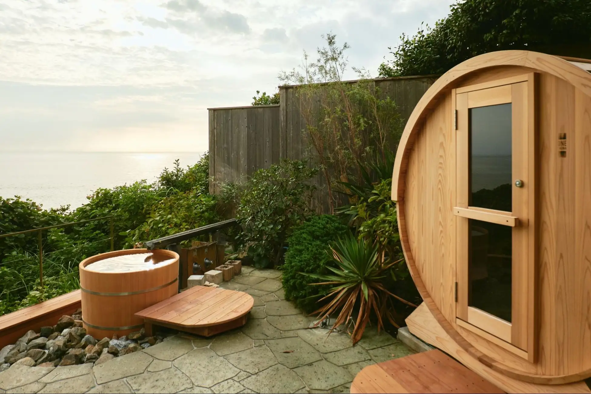 海を眺めながら楽しむボックスサウナ。目の前には大きな水風呂があり、複数人でざぶんと入ることができます。サウナと水風呂を往復したあとは、ウッドデッキで潮風を感じながら、ゆっくりと“ととのう”ひとときを。