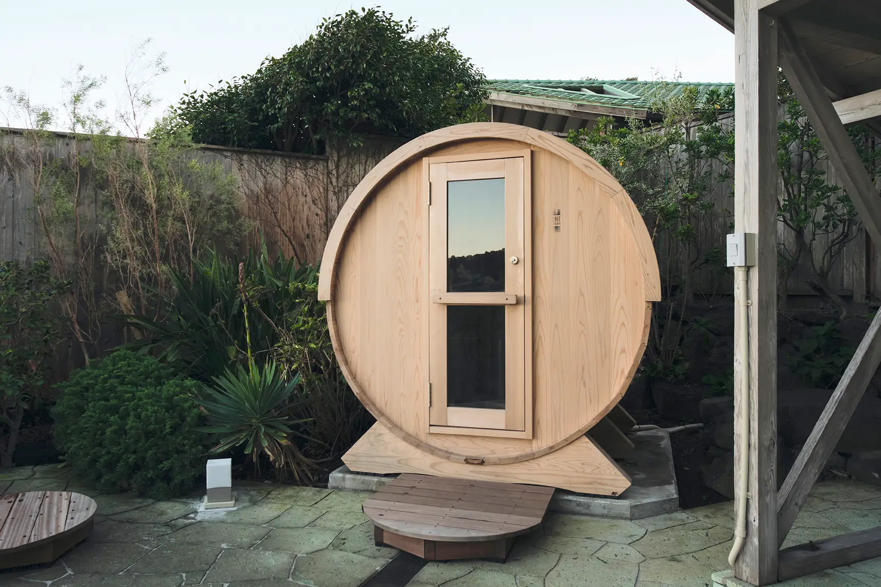 丸みのあるフォルムが印象的なバレルサウナを設置。