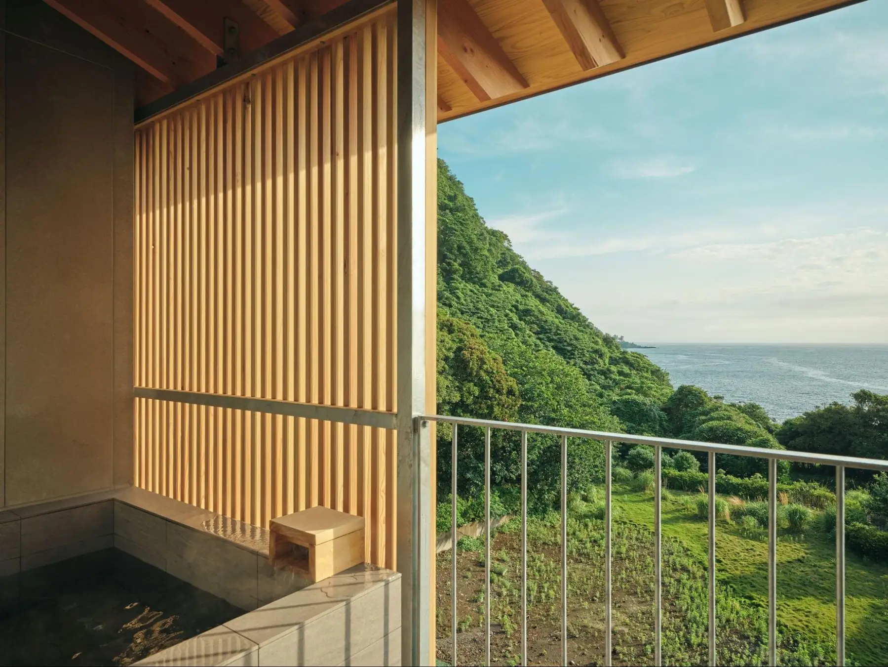 朝:水平線を眺めながらの穏やかな入浴。自室についている半露天風呂でゆっくり過ごす