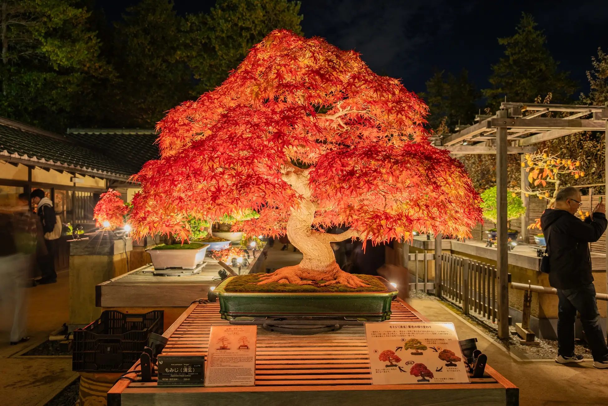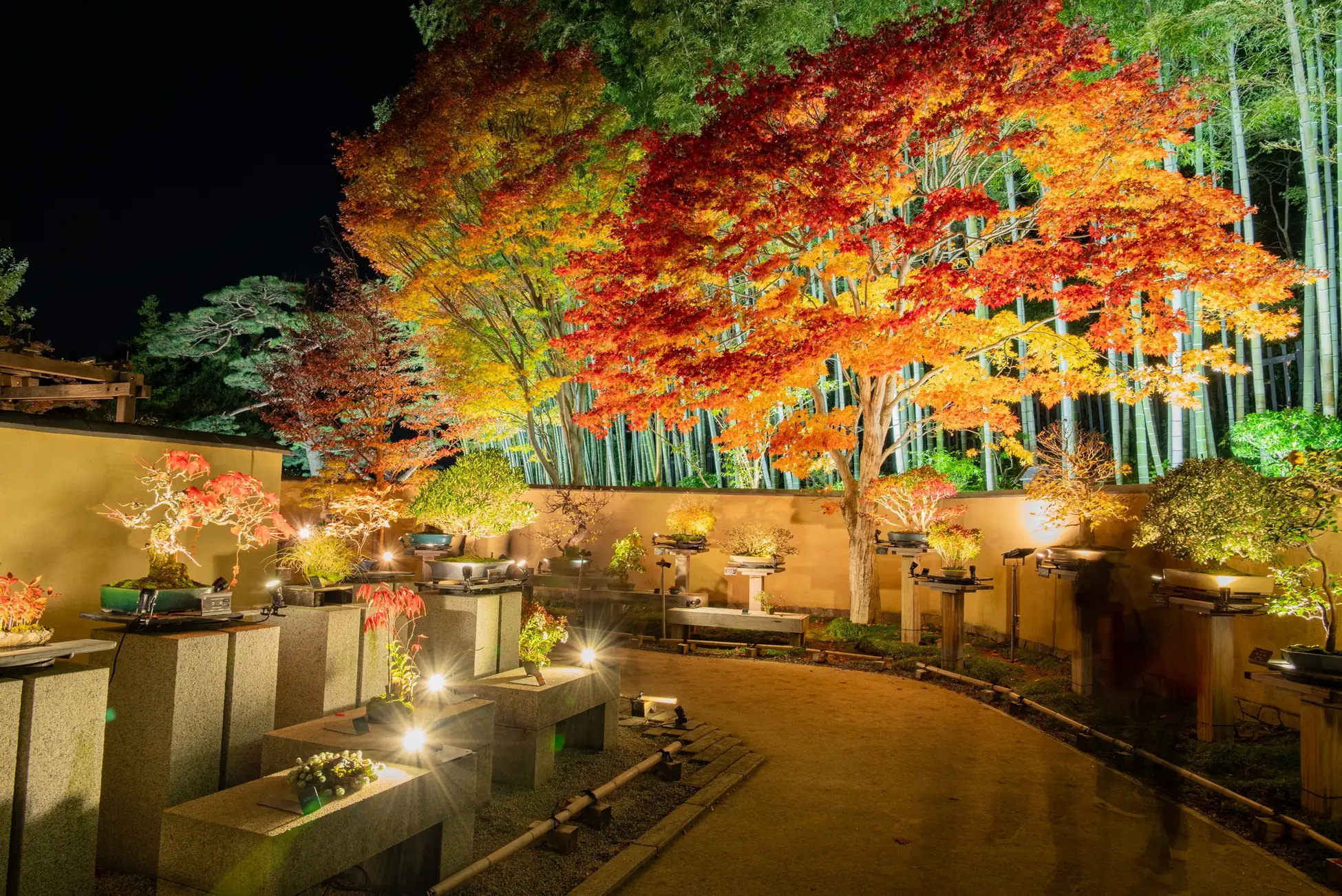 また、日本庭園内に2004年11月に我が国初の国営の本格的盆栽展示施設として整備された「盆栽苑」では、開苑から20周年を迎えた昨年に初めてライトアップを開催したところ、大変ご好評をいただいたため、今年もライトアップを実施することになりました。並べられている盆栽は国風盆栽展クラスの名品盆栽の数々で、そんな盆栽の良さを引き立てるための光の色やライティングにこだわっています。