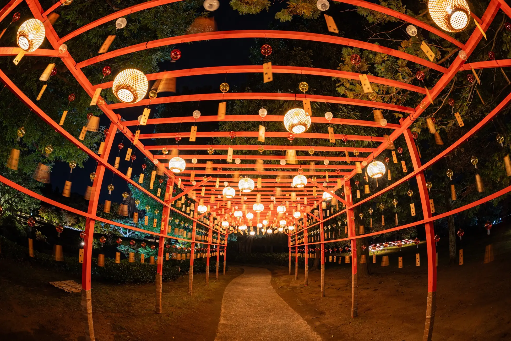 他にも和傘や風鈴を用いた演出や和傘の無料貸出など、「和」の演出で訪れる方をおもてなし。池の周りを巡り、ライトアップされた約300本のモミジや、松の雪つりなど自然の木の美しさを楽しみながら風情あるフォトスポットをお楽しみいただけます。