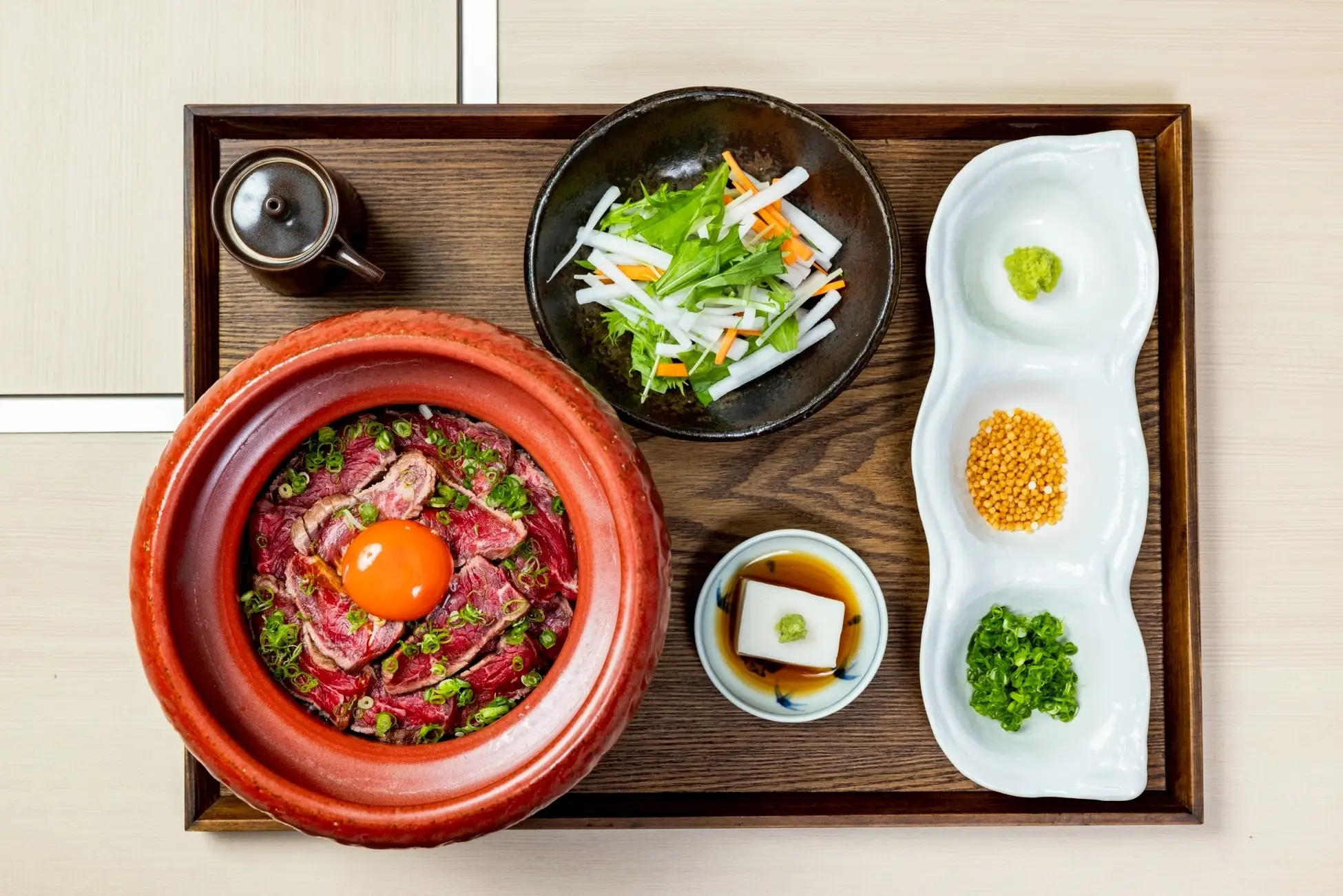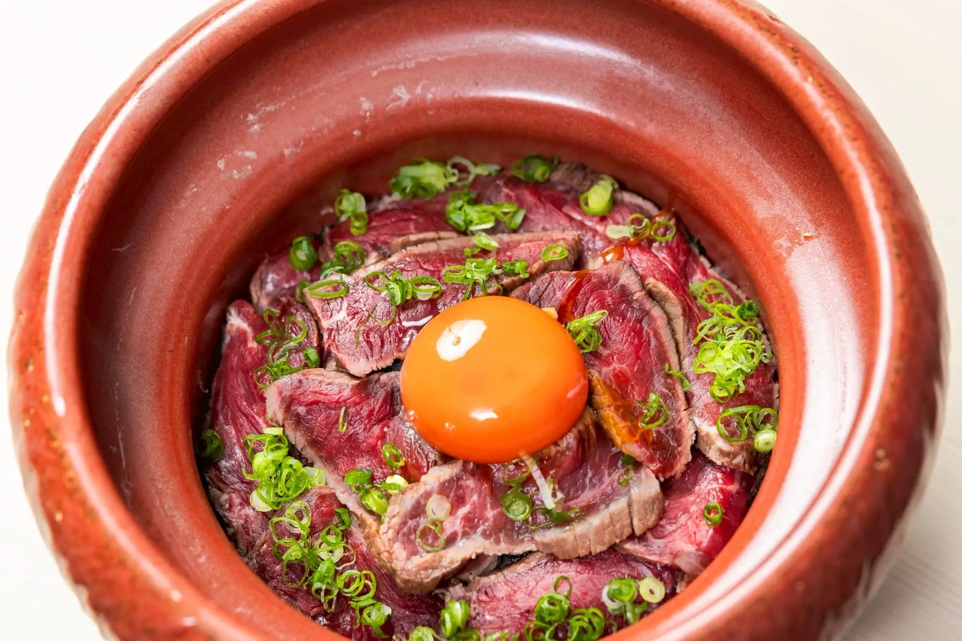 香ばしく焼き上げた和牛をご飯に贅沢に敷き詰め、京都産の濃紅卵を絡めて味わう至福の一杯。