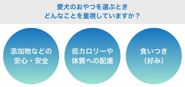 飼い主さんが重視するおやつ選びのポイントを整理すると、「安心・安全(添加物など)」「健康・体質への配慮(低カロリーやアレルギーなど)」「食いつき(好み)」の3つが浮かび上がってきました。