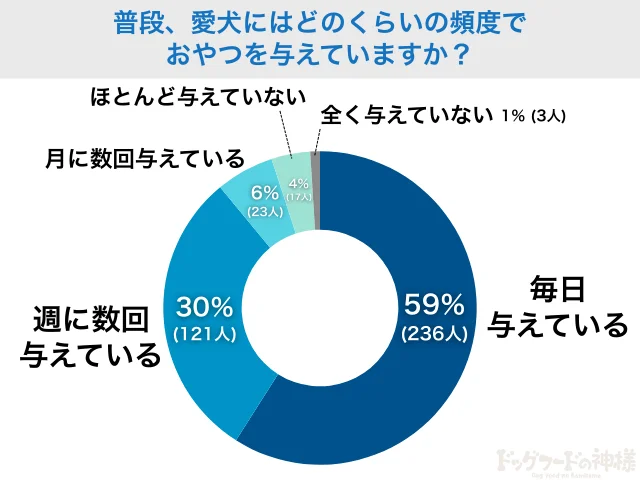 アンケートの結果、「毎日おやつを与えている」が59%で最多となり、「週に数回」(30%)を含めると、約9割の飼い主さんが日常的におやつを取り入れていることが分かりました。