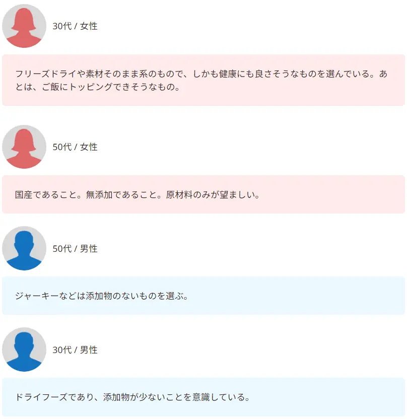 具体的には、国産・無添加・原材料がシンプルな商品や、添加物が少ないジャーキー、フリーズドライを選ぶといった意見が挙がっていました。