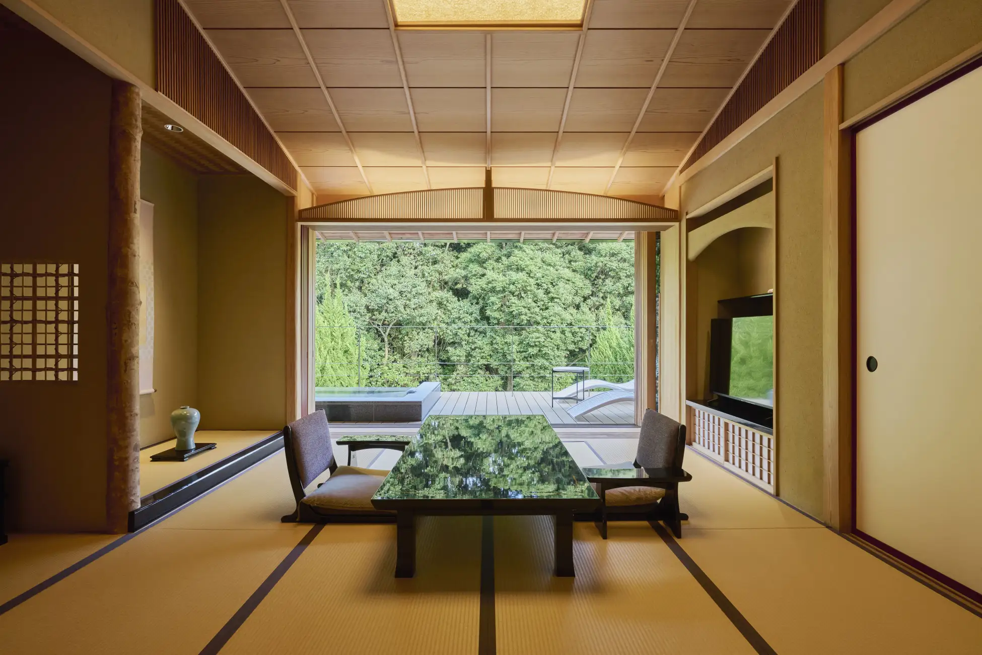 広大な敷地の中に佇む、わずか15室の贅沢な空間。すべての客室に海洋深層水の露天風呂を完備しており、ミネラル豊富な湯を独り占めできます。また日本の建築美を極めた数寄屋造りの空間と、心尽くしのおもてなしで、日常を忘れる優雅なひとときを提供いたします。