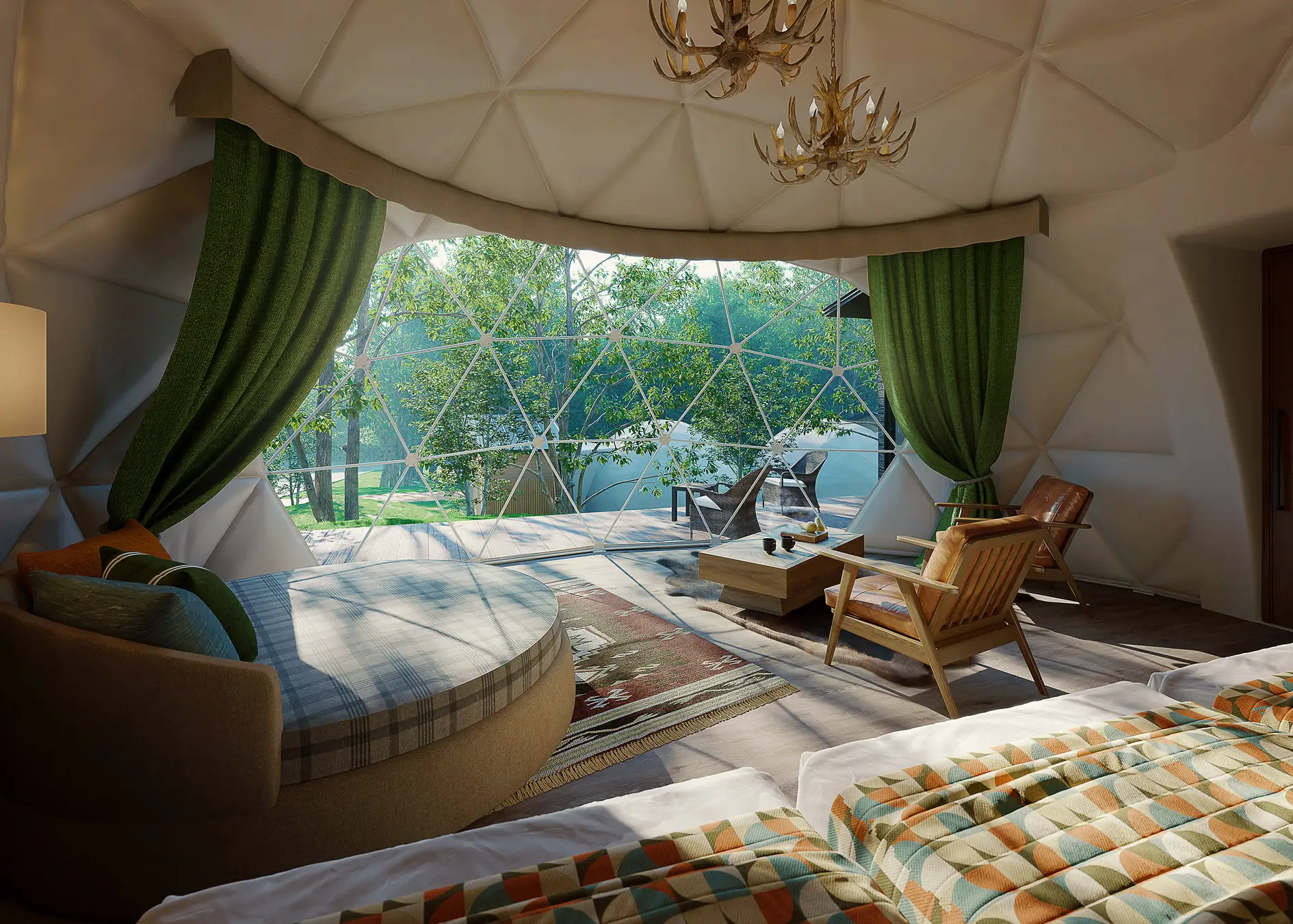 京都・るり渓で人気を博すグランピングブランド「GRAX」が、ついに伊豆へ進出いたします。 自然の地形をそのまま活かした広大なフィールドには、快適性とデザイン性を兼ね備えた32サイトのドームテントを完備。全サイトにはシャワールームを備えております。さらには、伊豆の食材を使った本格BBQ や料理人が仕込んだ前菜料理など、お食事も充実。揺らめく焚き火を囲むひとときなど、五感で自然を感じるラグジュアリーなアウトドアステイを提供します。