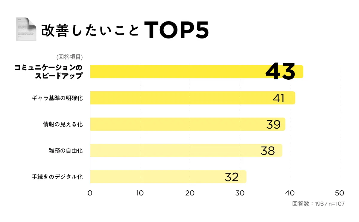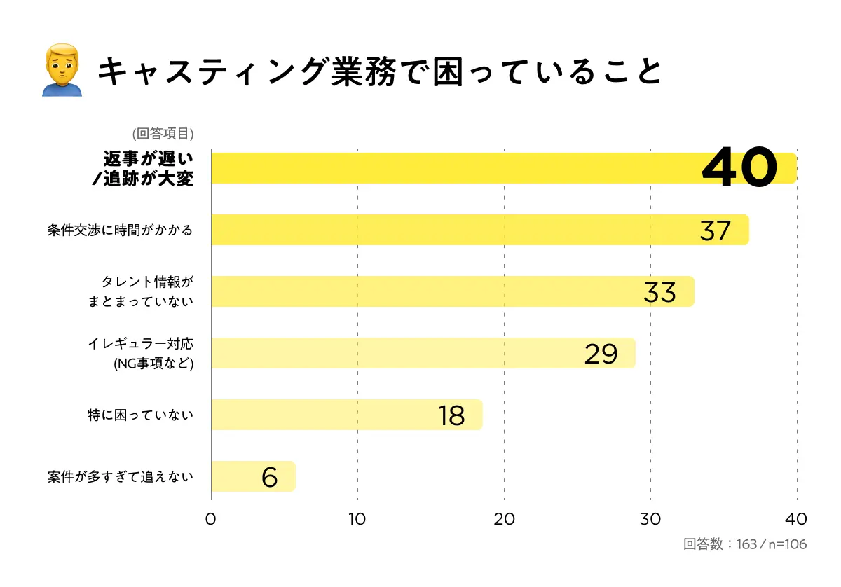 キャスティング業務においてもコミュニケーションコストの課題が上位を占めており、前述の「改善ニーズ(スピード・情報の見える化)」と関連していることがうかがえます。