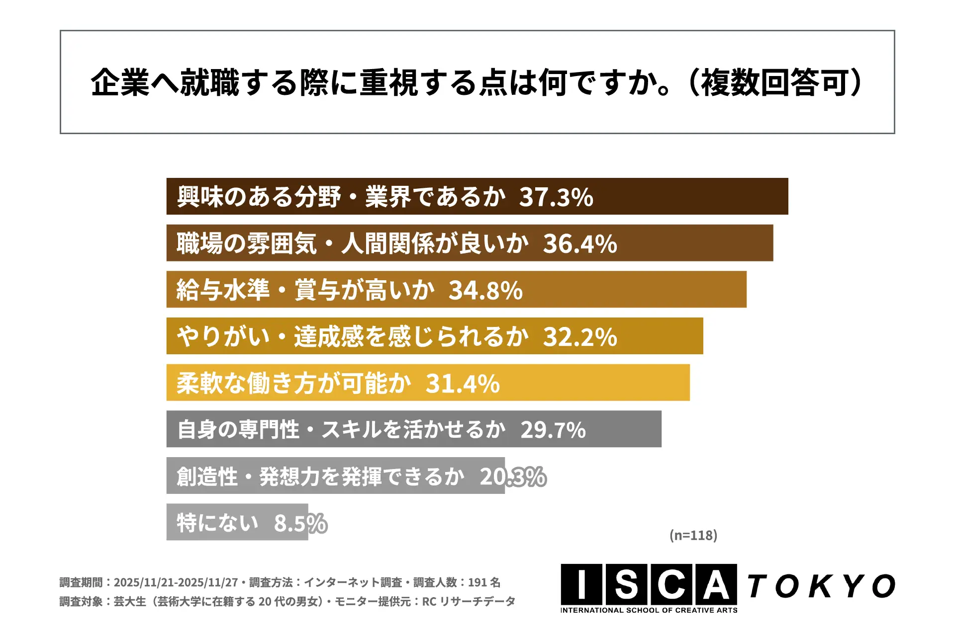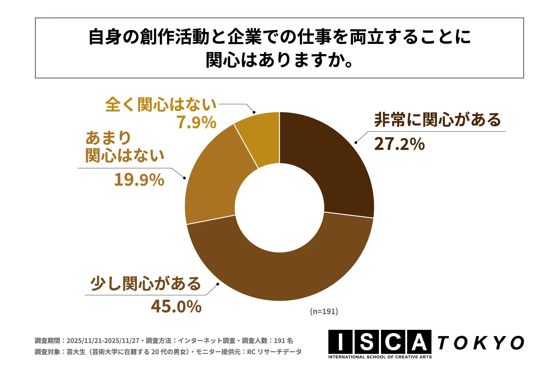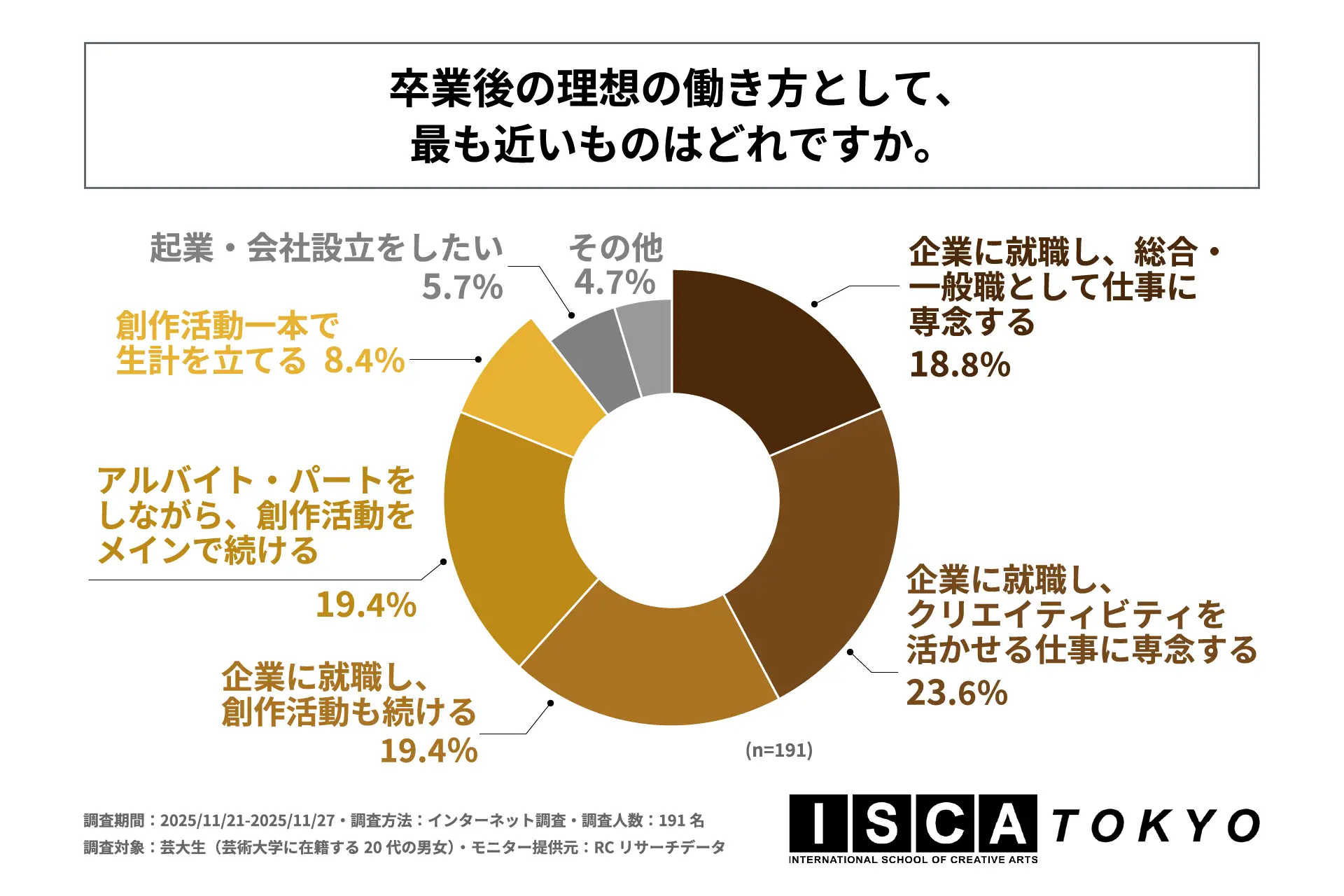 近年、働き方の多様化や経済的な不透明さを背景に、芸術分野を志す学生の間でもキャリアに対する意識変化が起きています。かつてのような「創作活動一本で生計を立てる」という専業志向だけでなく、企業での仕事を通じて安定した収入を得ながら、自身のクリエイティビティを社会で活かしたいと考える学生が増えていると推測されます。しかし、一般的な就職活動に関する調査は多いものの、専門性を持つ芸術大学の学生が、卒業後の「創作」と「生活」のバランスをどのように捉え、どのようなキャリアパスを現実的な選択肢として描いているのか、その実態は十分に明らかになっていません。そこで「ISCA TOKYO」は、芸大生を対象に「芸大生のキャリア意識に関する調査」を実施しました。