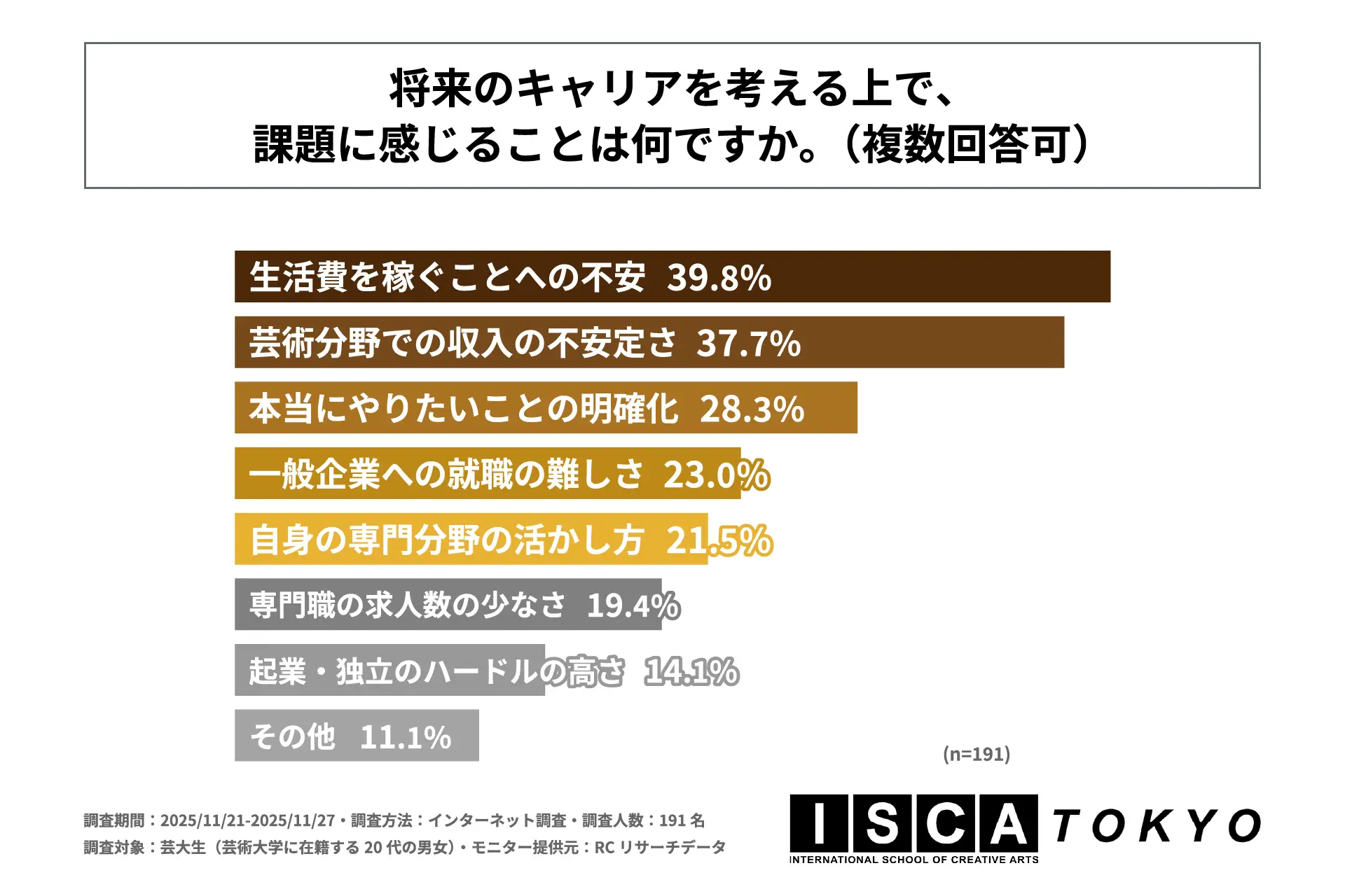 調査の最後、芸大生を対象に「将来のキャリアを考える上で、課題に感じることは何か」を尋ねる設問への回答では、1位が「生活費を稼ぐことへの不安」で39.8%、2位が「芸術分野での収入の不安定さ」で37.7%、3位が「本当にやりたいことの明確化」で28.3%という結果になりました。この結果から、芸大生が将来のキャリアに対して感じる課題は、主に「生活費を稼ぐことへの不安」や「芸術分野での収入の不安定さ」といった金銭面の不安であることが判明しました。