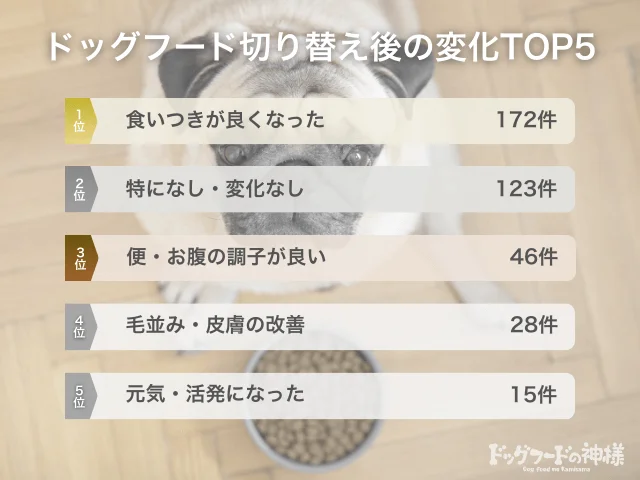 変化の1位は「食いつき改善」が約半数。体調面では「うんち」の状態を健康のバロメーターにする人が多かった。