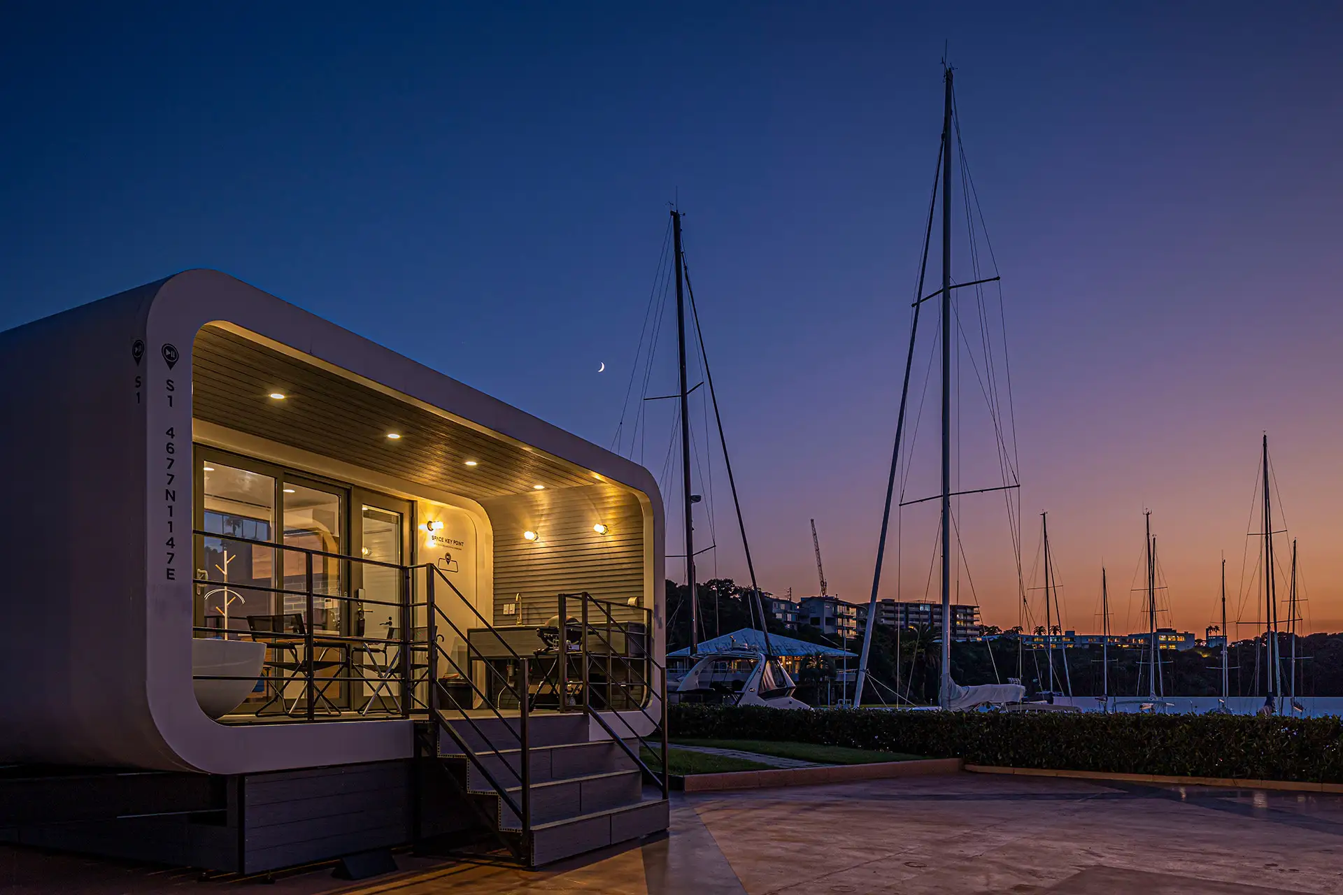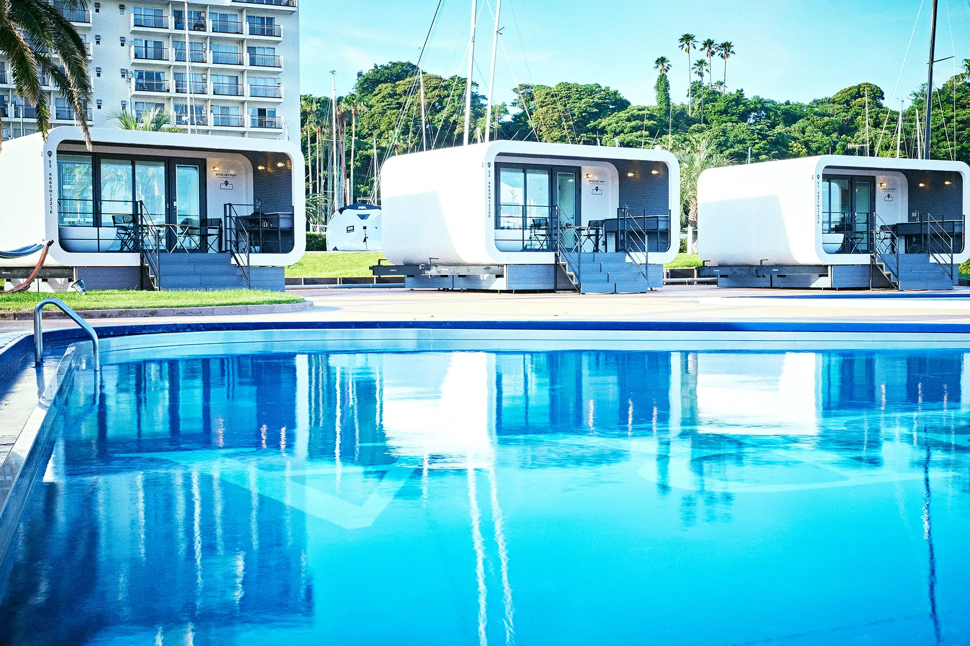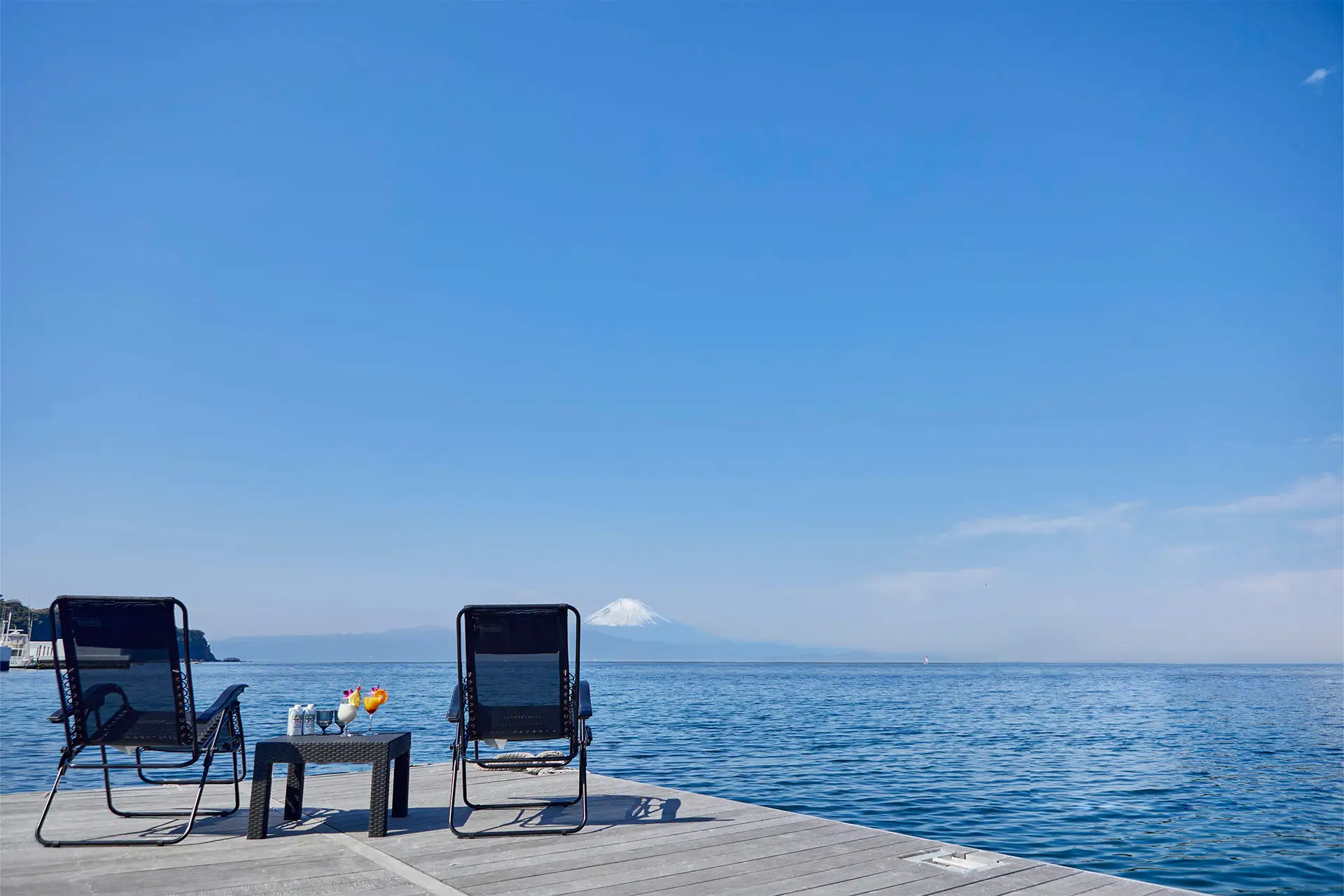 オーシャングランピング宿泊施設「スペースキーポイント」。完全貸切制のテントサウナでハーバー越しのサンセットと富士山に癒されながらととのう極上時間や、焚火を囲んでのスモアやプライベートデッキでの鍋など、冬ならではのグランピングをご堪能いただけます。