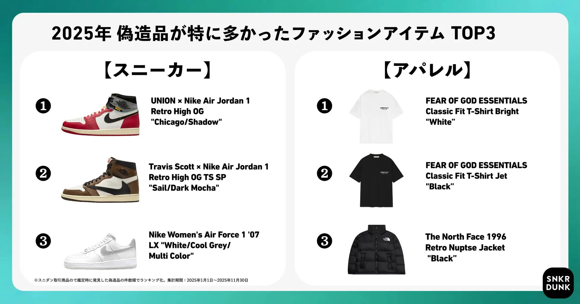 「UNION × Nike Air Jordan 1」でした。UNION(ユニオン)と「エアジョーダン 1」のコラボは、2018年に第一弾が大ヒットしたため、「第二弾も間違いなく人気になる」という注目商品であったことから、発売前から偽造品が数多く流通したといわれています。3位には「Nike Women’s Air Force 1」がランクインしています。「エア フォース 1」は女性人気も高く、定価で手に入る定番商品ですが、”欲しい人”が多いことを背景に偽造品が作られています。スニーカーについては、「希少性があるプレミア価格のつく商品」と「定価で手に入る人気の定番商品」の2つの傾向で作られていることが、偽造品の最新トレンドといえます。また、これまではメンズスニーカーの偽造品が数多く流通していましたが、2025年はレディーススニーカーの偽造品も増えている傾向にあります。