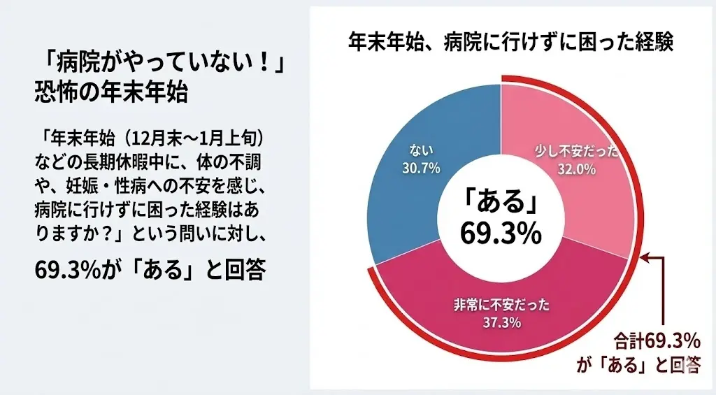 「年末年始(12月末〜1月上旬)などの長期休暇中に、体の不調や、妊娠・性病への不安を感じ、病院に行けずに困った経験はありますか?」という問いに対し、69.3%が「ある」と回答(「非常に不安だった」37.3%、「少し不安だった」32.0%)。