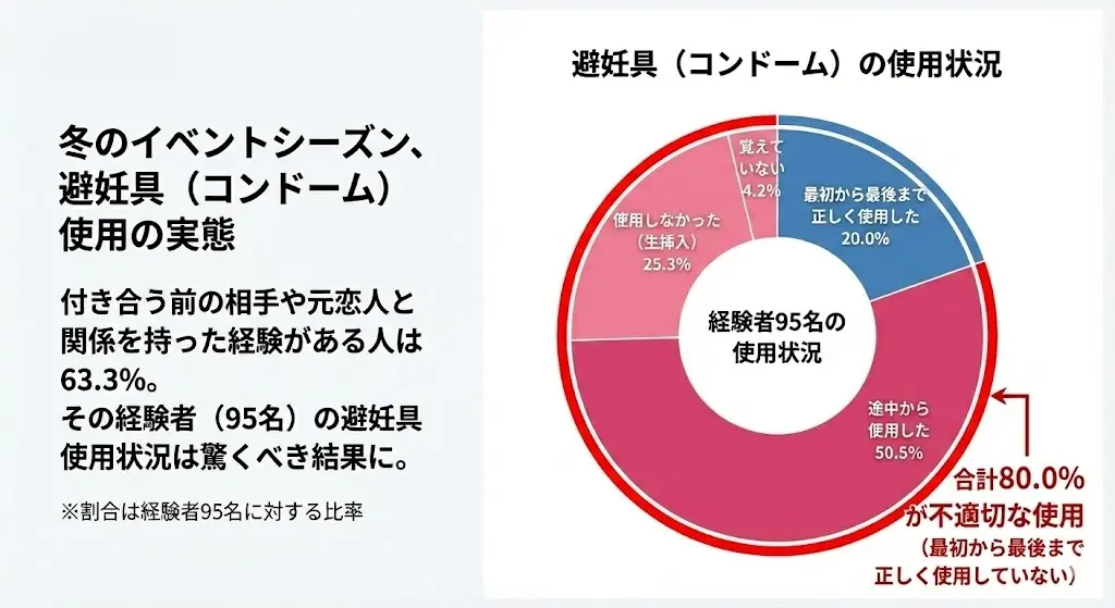 さらに、その経験者のうち80.0%が、その行為の際に「避妊具を使用しなかった」「途中から使用した」「覚えていない」と回答。冬のイベントシーズンという環境要因が、性感染症リスクに影響を及ぼす可能性が示されました。