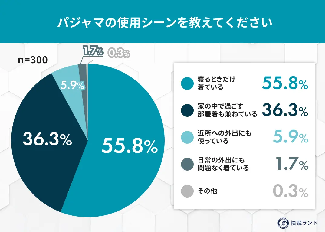 使用シーンは 寝るとき専用(55.8%) が半数超。家中の部屋着として併用する人も36.3%