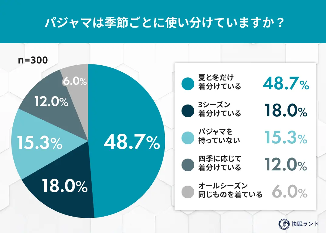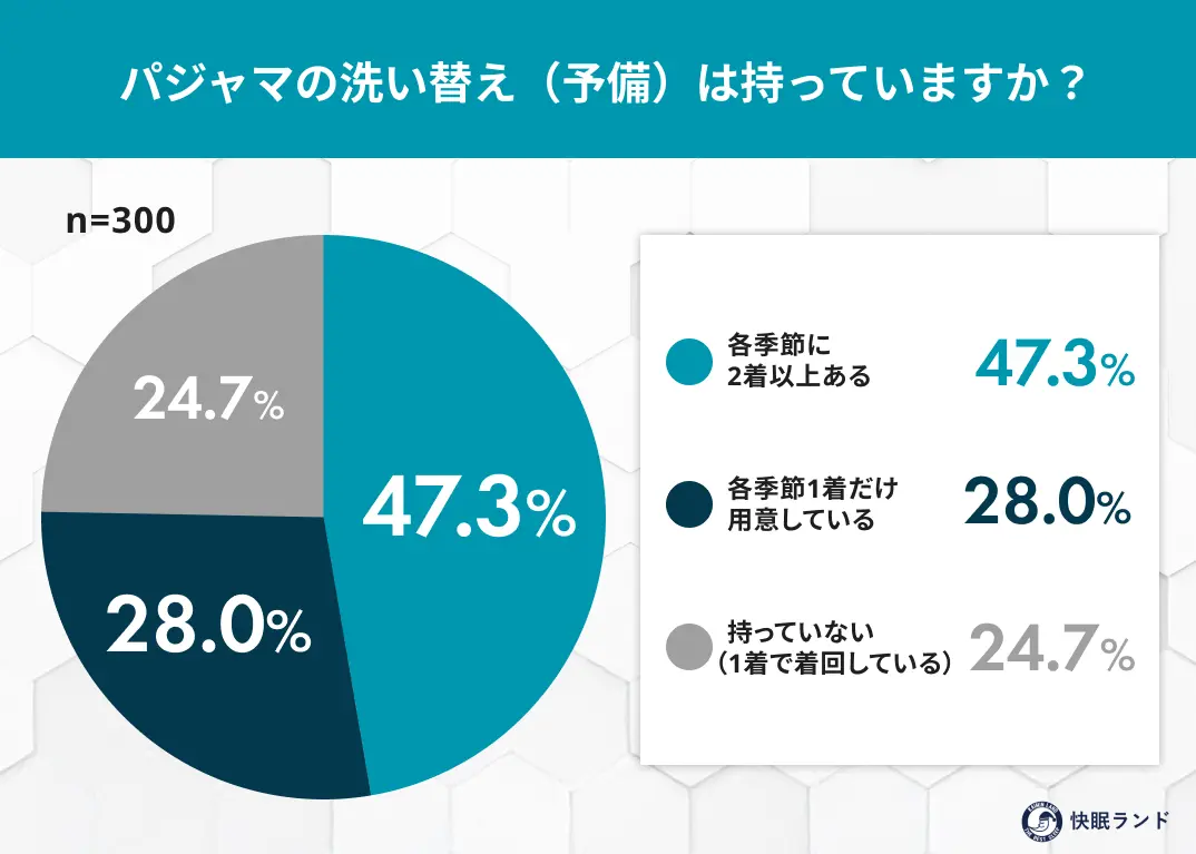 朝晩の寒暖差が大きくなるこの季節、寝付きや睡眠の質を左右する「パジャマ選び」に注目が集まっています。快眠グッズ紹介サイト「快眠ランド」を運営する「ムーンムーン株式会社」は、全国の男女300名を対象に「パジャマの所有枚数・季節別の使い分け・買い替え頻度」に関する調査を実施しました。その結果、「2着〜4着で着回す人」が全体の半数近くを占め、さらに 78.7%が季節に応じて着分けている ことが判明。パジャマは“ただ寝るための服”ではなく、気温・快適さ・衛生面に合わせて使い分ける日常アイテムとして定着している様子がうかがえます。