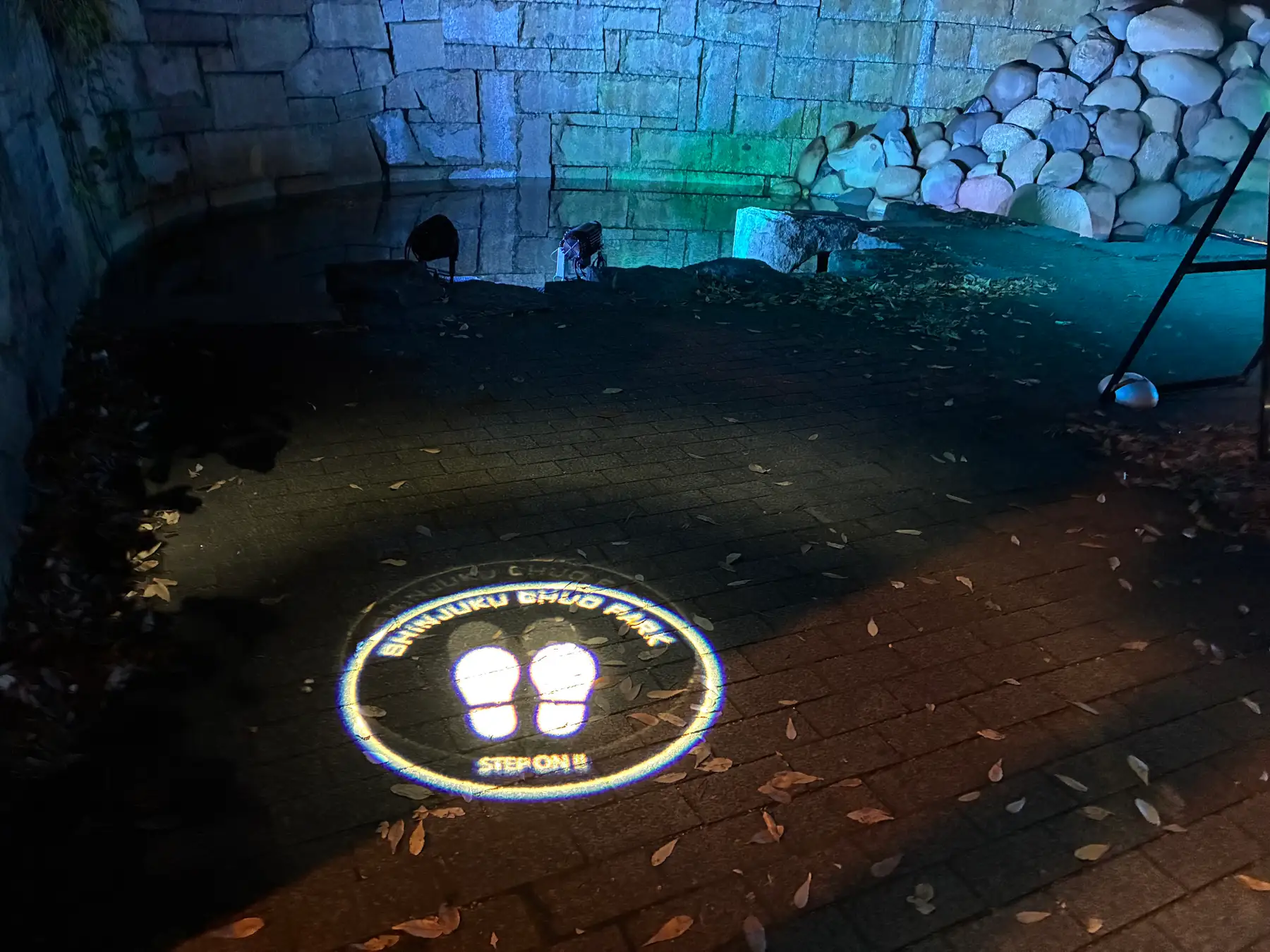 新宿ナイアガラの滝の左横の地面に投影されている足跡マーク。その上に音が鳴るまで立つと、滝の色を変えることができます。是非、カラーチェンジの仕掛けをお楽しみくださいませ。