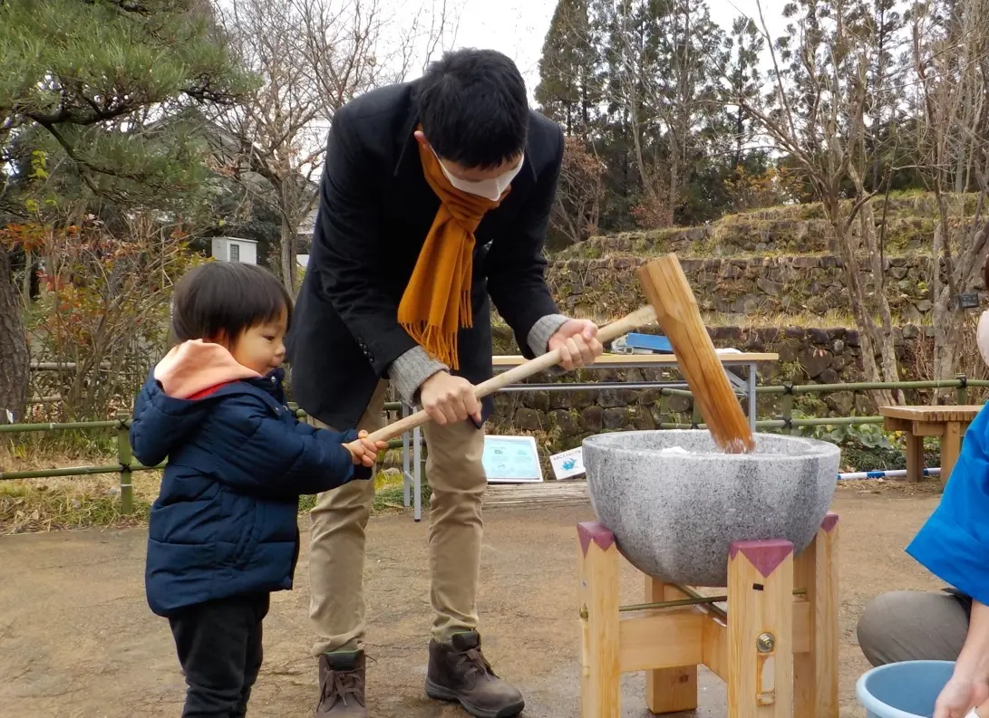 杵と臼を使って餅つきに挑戦!ついた餅でミニ鏡餅も作ります。