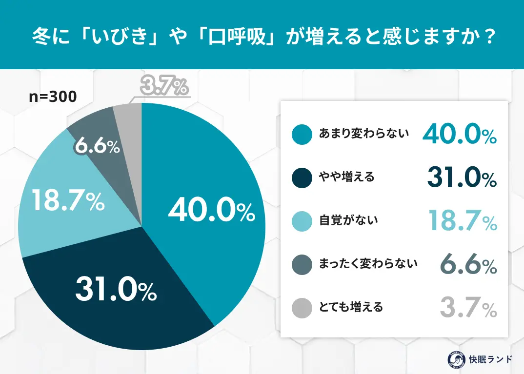 → 冬のいびきや口呼吸について、約3割が「増える」と実感。寒暖差や乾燥など、冬特有の環境変化が睡眠時の呼吸状態に影響している可能性がうかがえます。