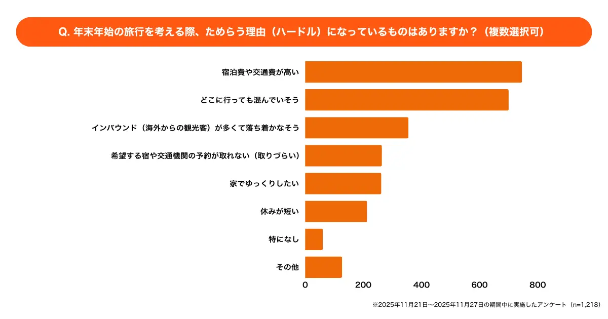 2つの大きなハードル: 年末年始の旅行をためらう理由(複数回答)は「宿泊費や交通費が高い(61.2%)」と「どこに行っても混んでいそう(57.5%)」が突出しています。