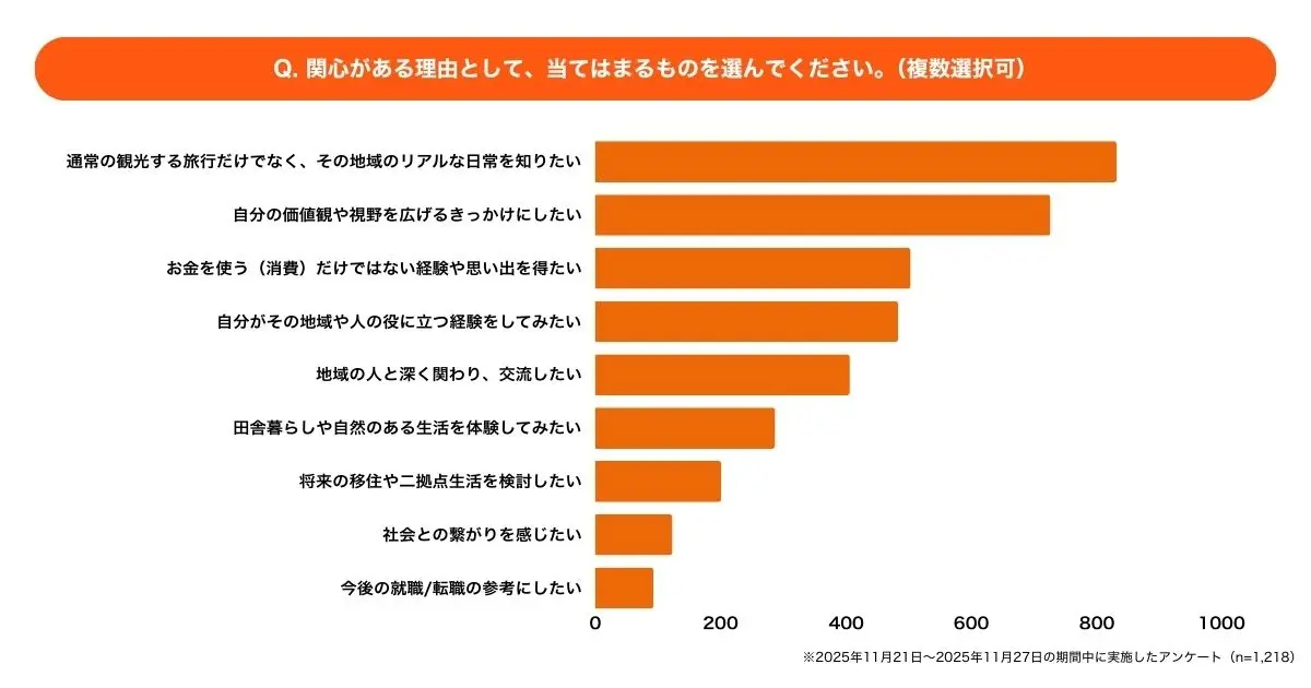 物価高や混雑が年末年始の旅行のハードルとなっていることに加えて、旅行者が旅・旅行に求める価値観そのものも変化しています。『有名な観光地や名所を巡る一般的な「旅行」だけでなく、地域の人と交流したり、その地域ならではの生活を体験するような旅にも関心がありますか?』という問いに対し、96.9% が「関心がある」と回答しました。その理由として、「その地域のリアルな日常を知りたい(70.5%)」や「自分の価値観や視野を広げるきっかけにしたい(61.5%)」が上位に挙がりました。