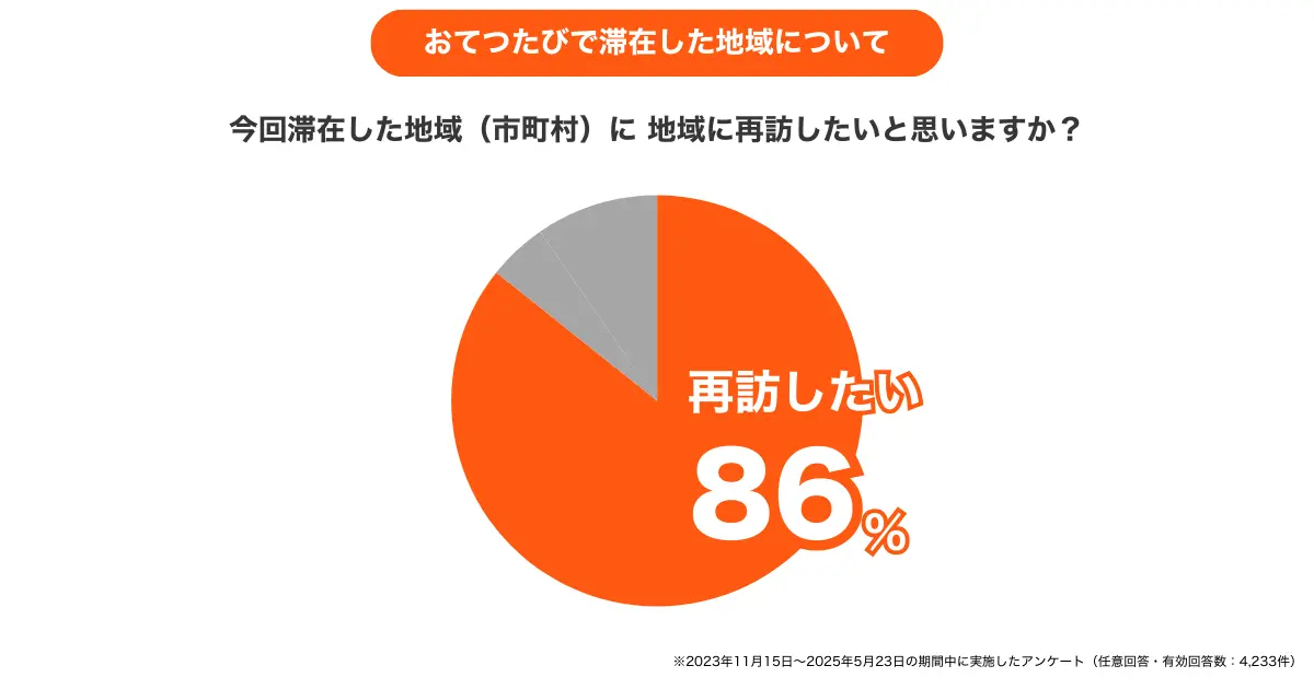 おてつたび参加者の86%が「また滞在した地域に再訪したい」と回答しており、おてつたびのような「地域と関わる旅(関係旅行)」によって、一度きりの観光では終わらない繋がり(関係人口)が生まれていることが分かります。