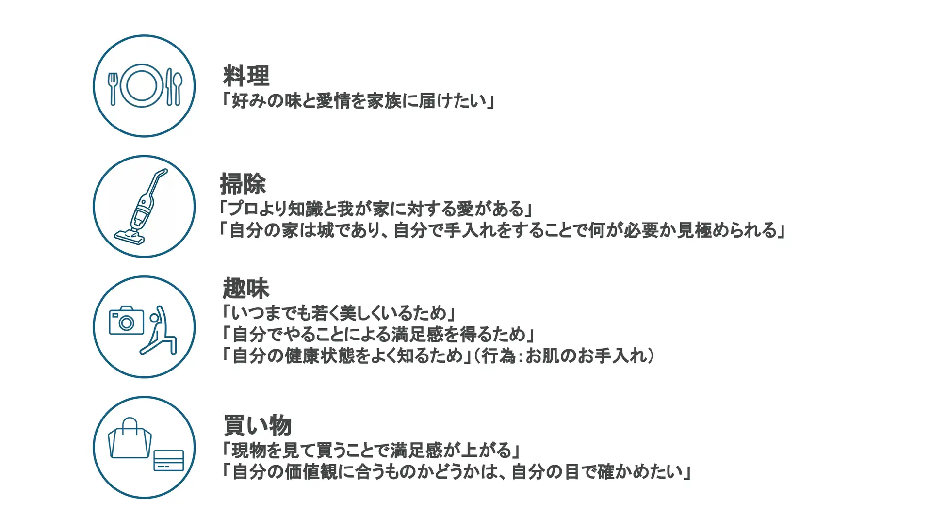 ・外注できる領域でも、安心感・品質・満足感を理由に「自分でやる」ことを選ぶケースが見られ、時間の使い方が価値観そのものを反映