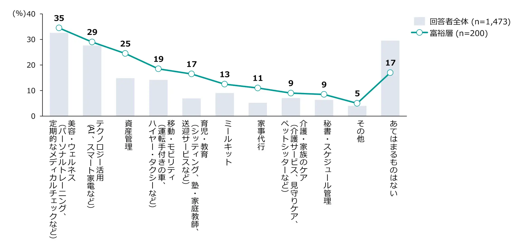 ・全体に比べ、「資産管理」「育児・教育」「家事代行」が高く、「移動・モビリティ」「ミールキット」などもやや高い。