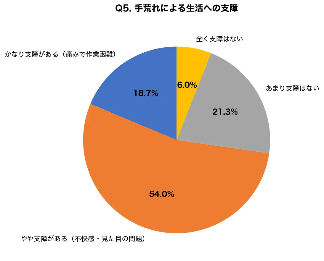 「かなり支障がある」と「やや支障がある」を合わせると72.7%に達し、手荒れが日常生活のQOL(生活の質)を著しく低下させていることが明らかになりました。痛みで作業が困難な方も18.7%おり、早期治療の重要性を示しています。