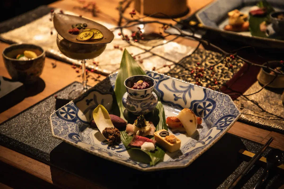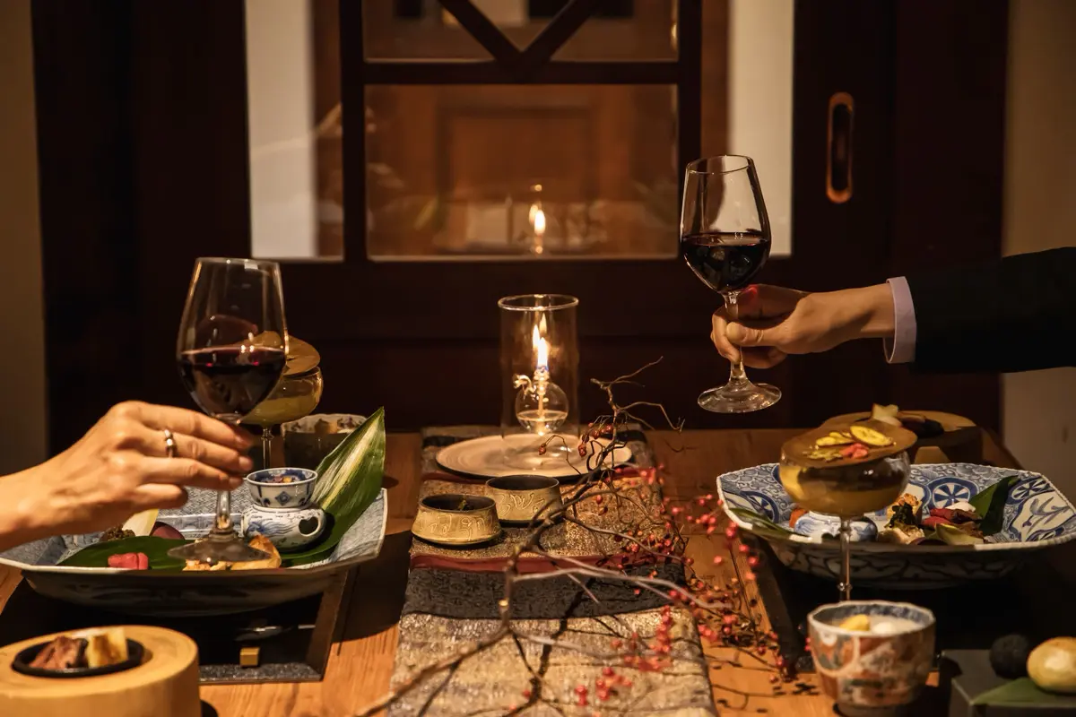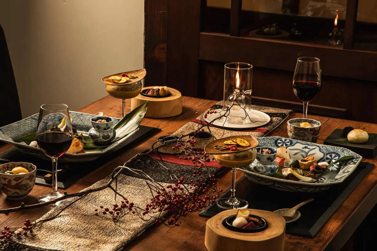 テーブルコーディネーター岩崎葉子監修のスタイリングでお食事ができる冬の平日限定の贅沢なプランです。ご夕食は、古伊万里などのアンティーク食器を基調に、現代の有田焼や漆器、作家ものを組み合わせたしつらえ。幾重の時代が融合する岩崎葉子の世界観を映したテーブルでご提供いたします。キャンドルの灯が窓辺に静かにゆらぎ、器の表情をそっと際立たせる冬の夜をお愉しみいただけます。