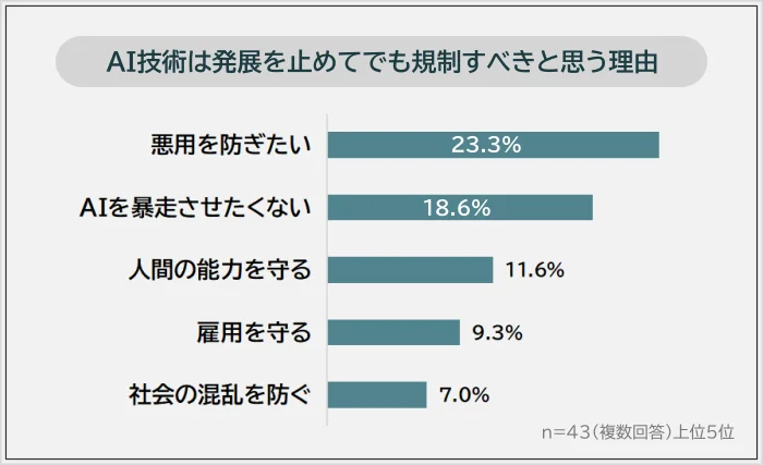 発展を止めてでも規制すべきと思う43人に理由を聞いたところ、1位は「悪用を防ぎたい(23.3%)」でした。2位「AIを暴走させたくない(18.6%)」、3位「人間の能力を守る(11.6%)」が続きます。