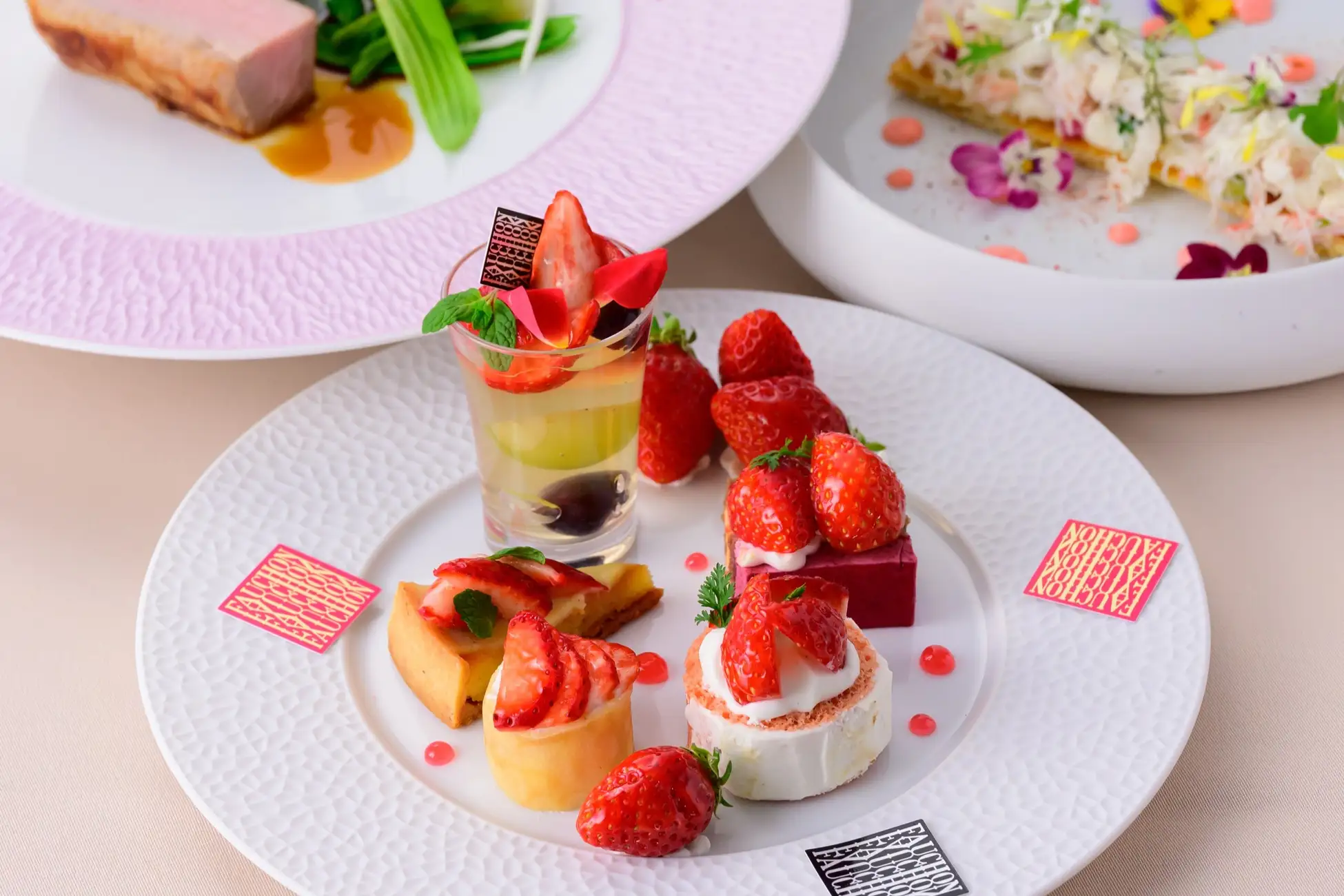 現在開催中のあまおうデザートビュッフェを付けた予約者に限り、人気のランチメニュー「ランチフォション」を5周年特別価格5,000円にてご提供いたします。「ランチフォション」は、アミューズからデザートまで全5品で構成され、選べるメイン料理やフォションシグネチャーデザート「ビズビズ」をミニサイズでお楽しみいただけます。見た目にも麗しく、滋味深い味わいでフォショングルメの世界へ誘ってくれるランチコースとして人気です。フォションホテル京都の人気ランチメニューの後には、可愛く、甘い、福岡県産の博多あまおうを用いたデザートの数々をご堪能ください。この時だけの特別価格で、料理とデザートを存分にお楽しみいただけるランチタイムをお過ごしいただけます。