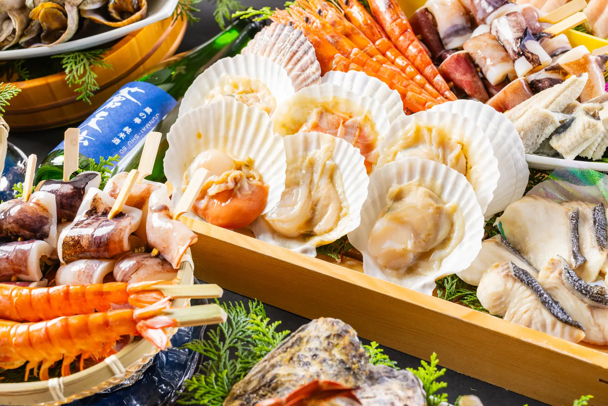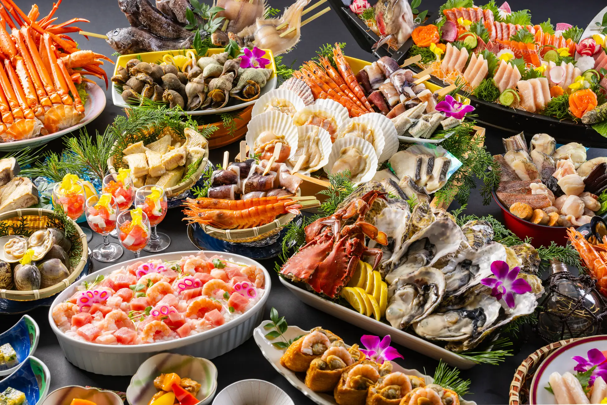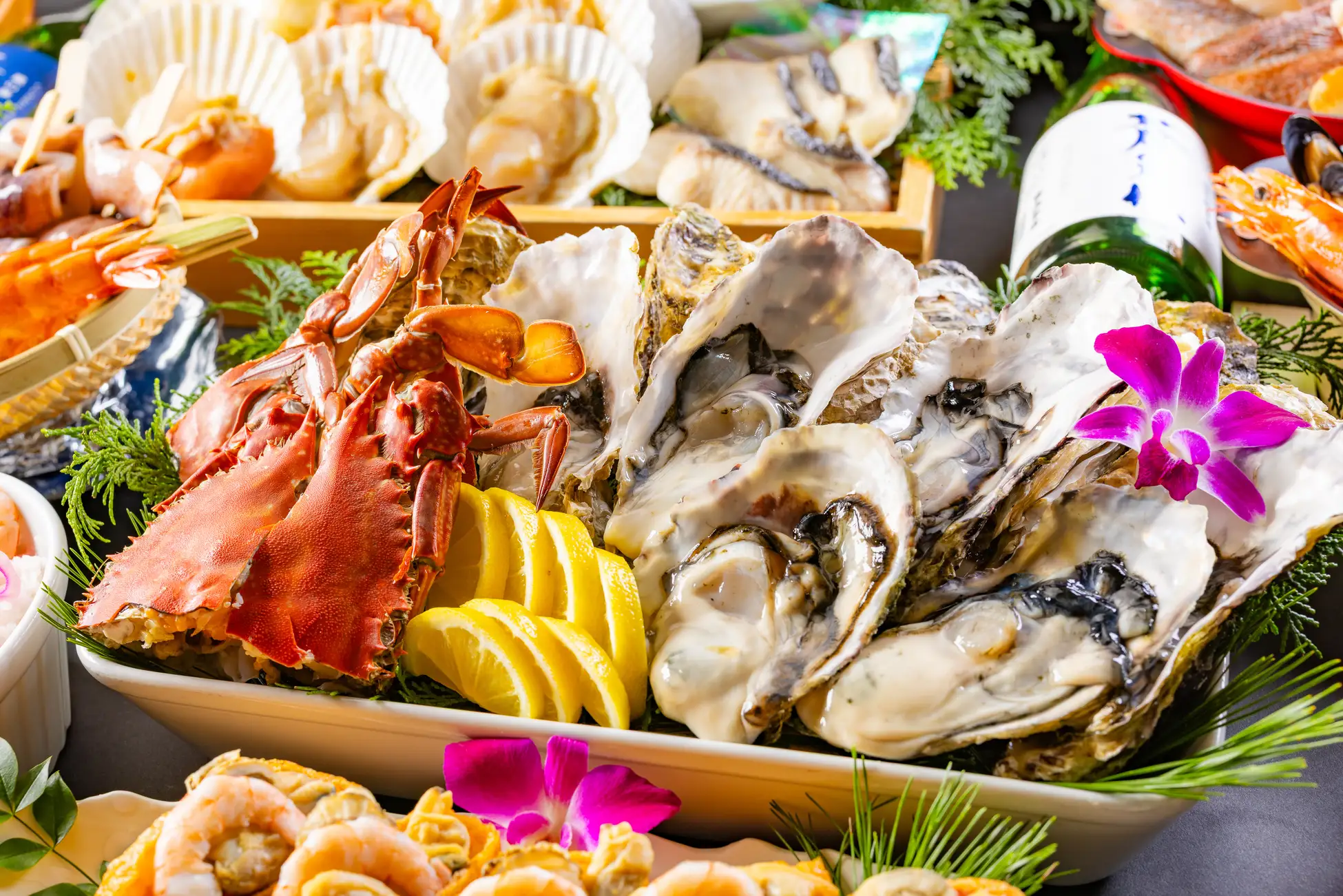 魚介をその場で焼き上げて味わう、島の食文化をイメージした“浜焼きスタイル”の夕食を提供します。冬に旬を迎える三陸産牡蠣をはじめ、北海道産帆立、カニなど、素材本来の旨みを楽しめるのが特徴です。
