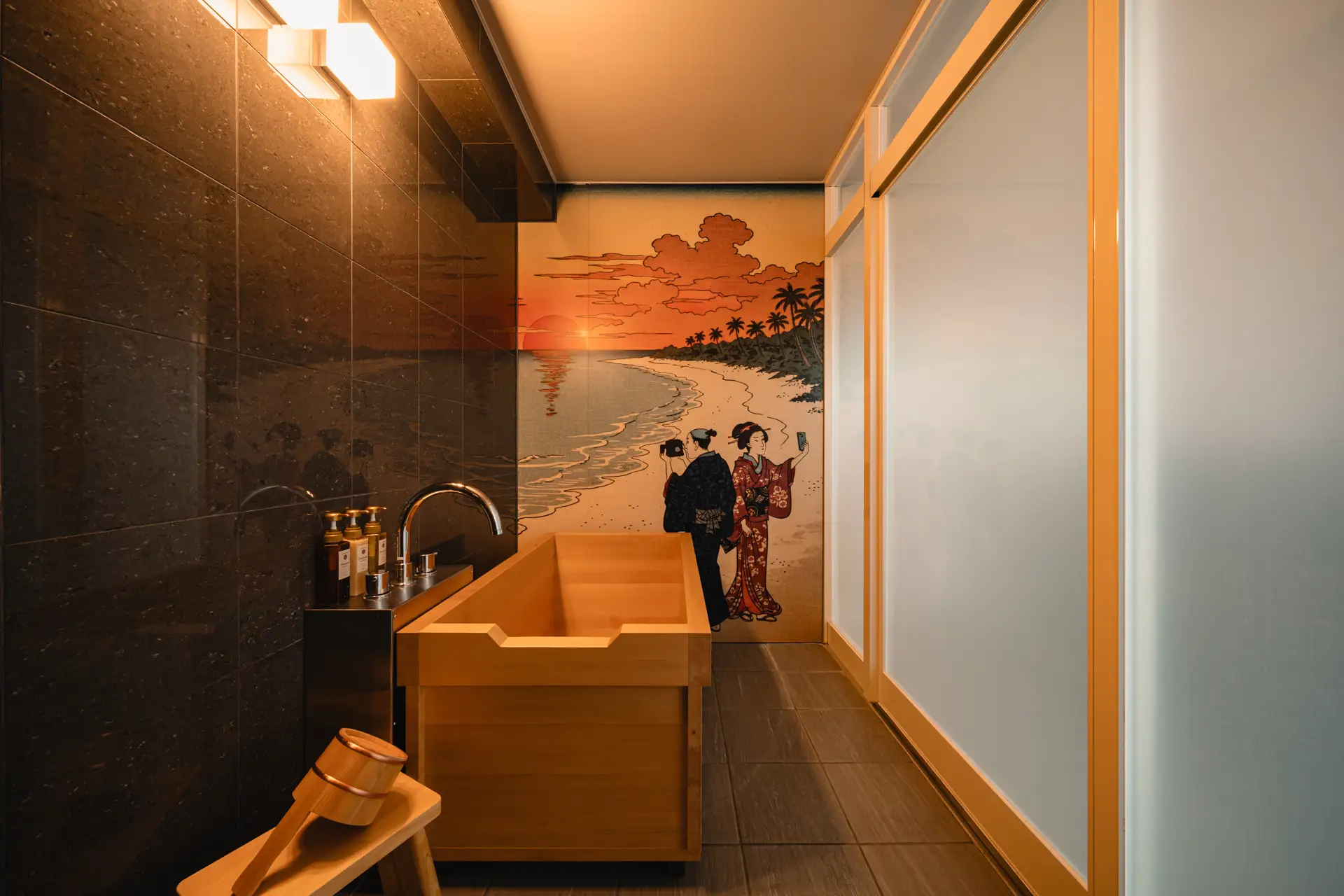 館内には、江戸時代の人々がタイムスリップして沖縄の自然や街を体感して楽しむ様子を描いた浮世絵アートを展示。伝聞ではなく、「来て、見て、体感した沖縄」 を楽しむ価値を視覚化しています。