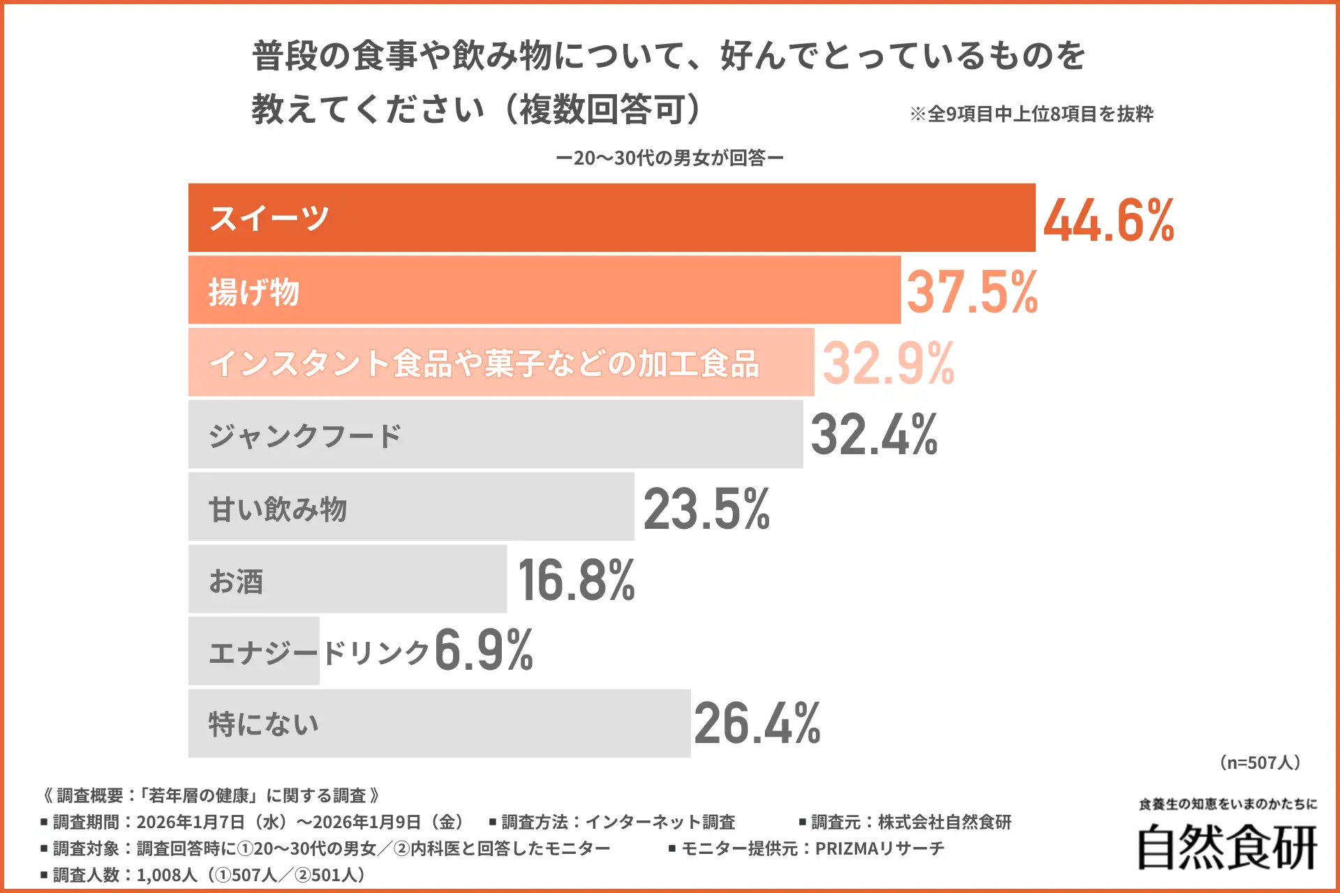 株式会社自然食研(所在地:大分県豊後高田市、代表者:佐々木 興平)は、①20~30代の男女/②内科医を対象に、「若年層の健康」に関する調査を行いました。