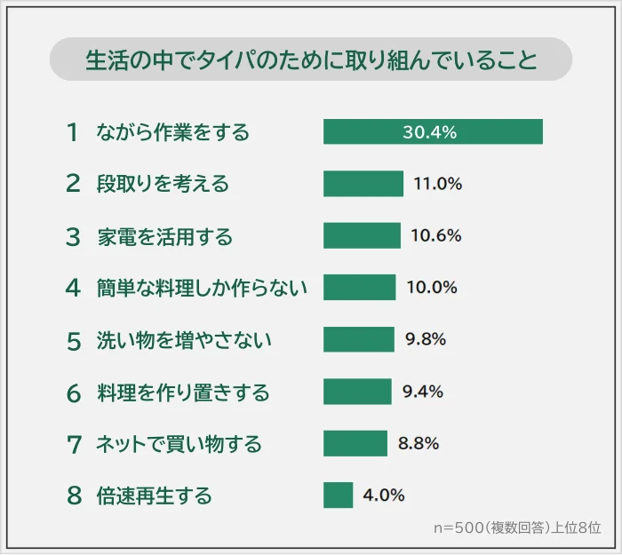 「生活の中でタイパのために取り組んでいること」を聞いたところ、1位は「ながら作業をする(30.4%)」でした。2位「段取りを考える(11.0%)」、3位「家電を活用する(10.6%)」、4位「簡単な料理しか作らない(10.0%)」が続きます。