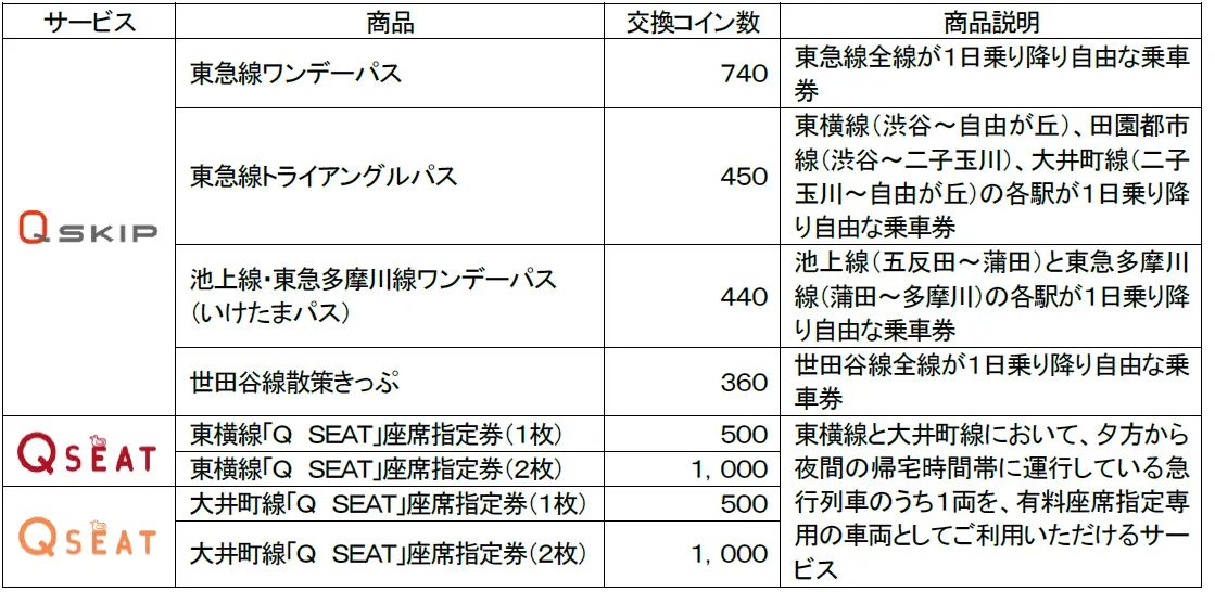 PASMOやSuica(モバイルPASMO、モバイルSuicaを含む)での東急線の乗車(定期券利用を除く)や、タッチ決済対応のクレジットカードであるTOKYU CARDでの東急線の後払い乗車、東急線PASMO定期券の購入、TOKYUCARDでの「Q SKIP」商品や「Q