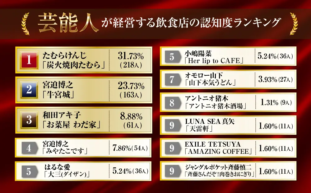 認知度1位のたむらけんじさん「炭火焼肉たむら」でも31.73%、約7割の人は認知していません。4位以下は10%を下回り、芸能人が経営していても一般の認知度獲得は容易ではないことが判明しました。