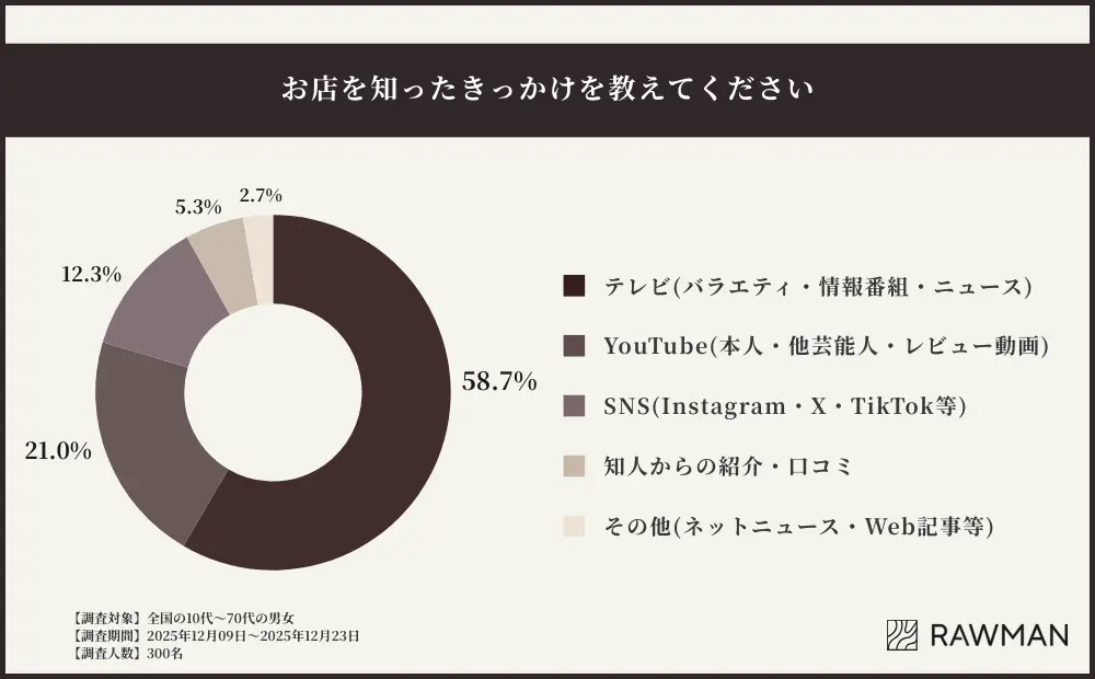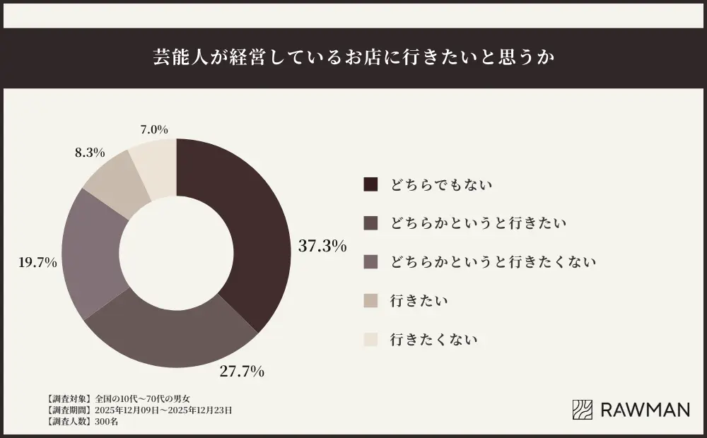 株式会社RAWMAN(本社:東京都渋谷区、代表取締役:中野翔介)は、芸能人が経営する飲食店に対する消費者の認知度と来店意向について、全国の10代〜70代の男女300人を対象に独自調査を実施しました。