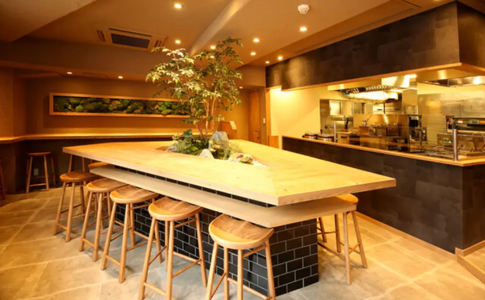 壁や中央に配された緑が、都会的でありながら落ち着ける空間を演出。カウンター席を中心としつつテーブル席も配し、一人客でも入りやすく、友人同士でも楽しめる柔軟性があります。