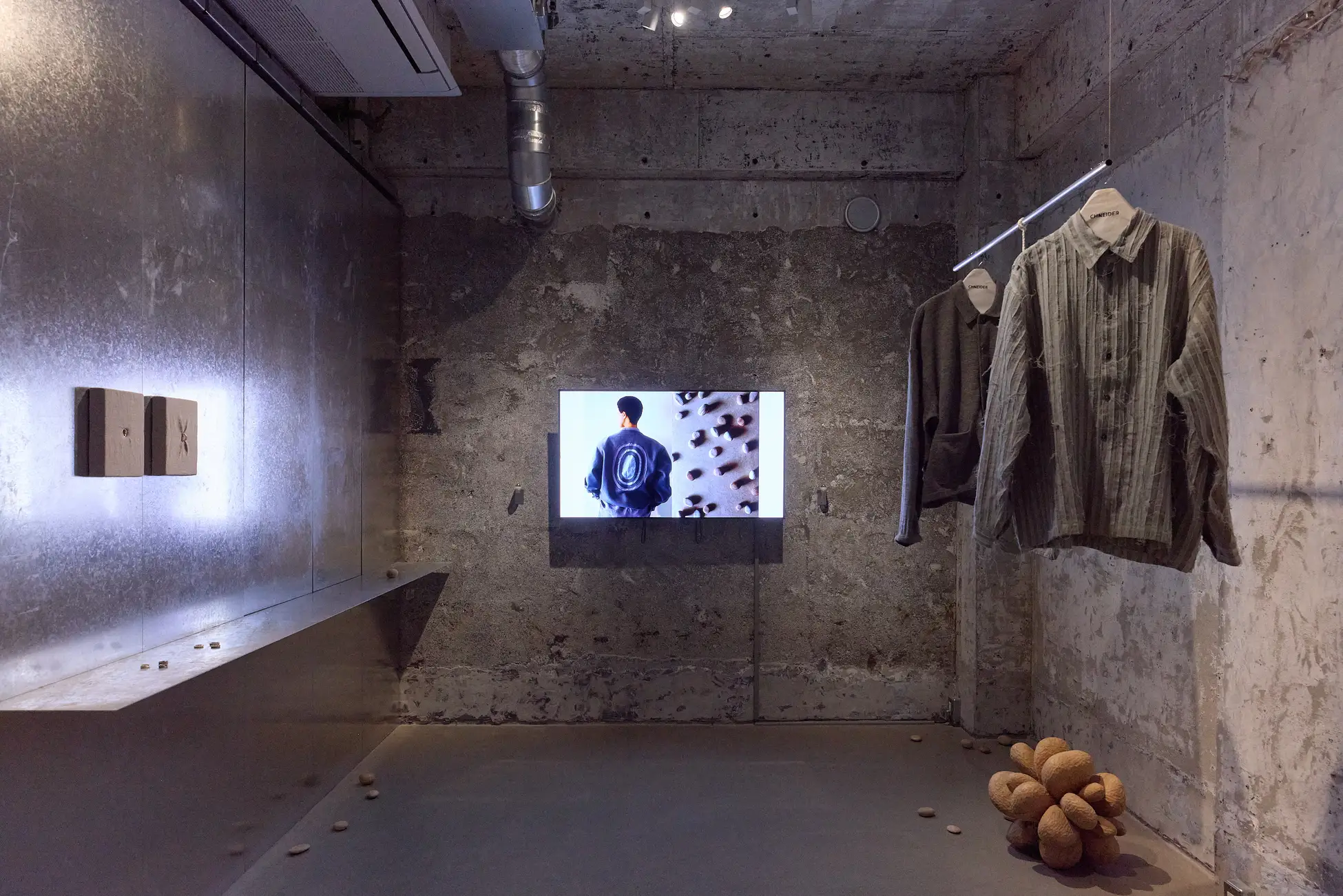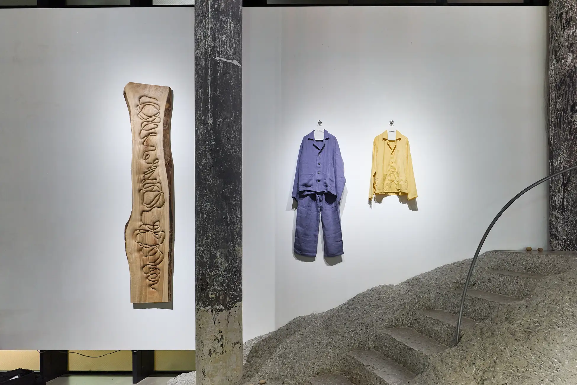 会場は、主に麻を使用した一点物の衣服を生み出すファッションブランド「CHNEIDER」の作品と、木という存在に寄り添い続ける彫刻家・髙山瑞の作品で構成されています。