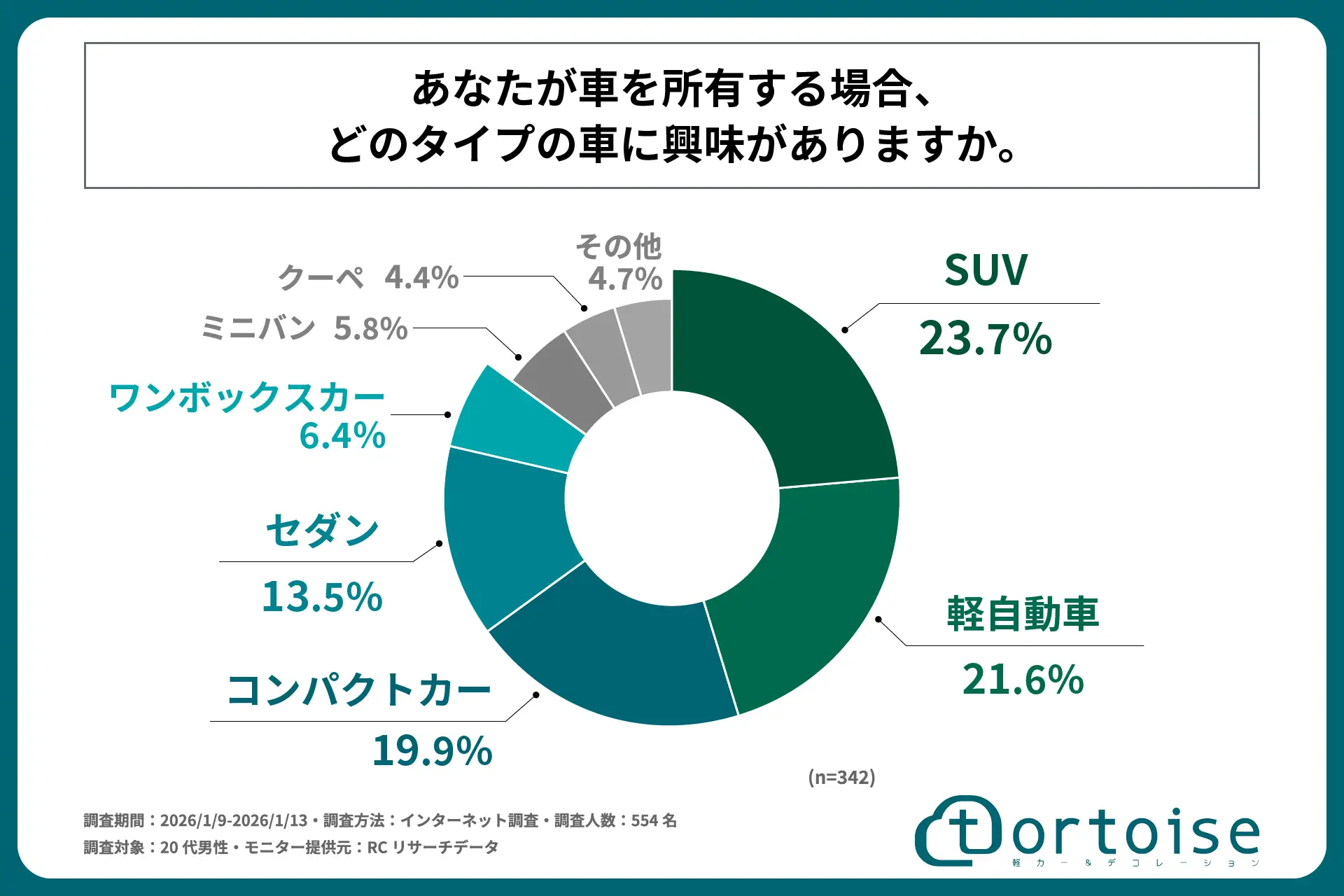 続いて、将来的に車を所有したい20代男性を対象に「車を所有する場合、どのタイプの車に興味があるか」を尋ねる設問への回答では、1位が「SUV」で23.7%、2位が「軽自動車」で21.6%、3位が「コンパクトカー」で19.9%という結果になりました。この結果から、将来的に車を所有したい20代男性の最も多くが、車を所有する場合「SUV」に興味を持っているものの、「軽自動車」や「コンパクトカー」といったタイプも僅差で続いており、これらへの興味も同様に高いことが明らかになりました。