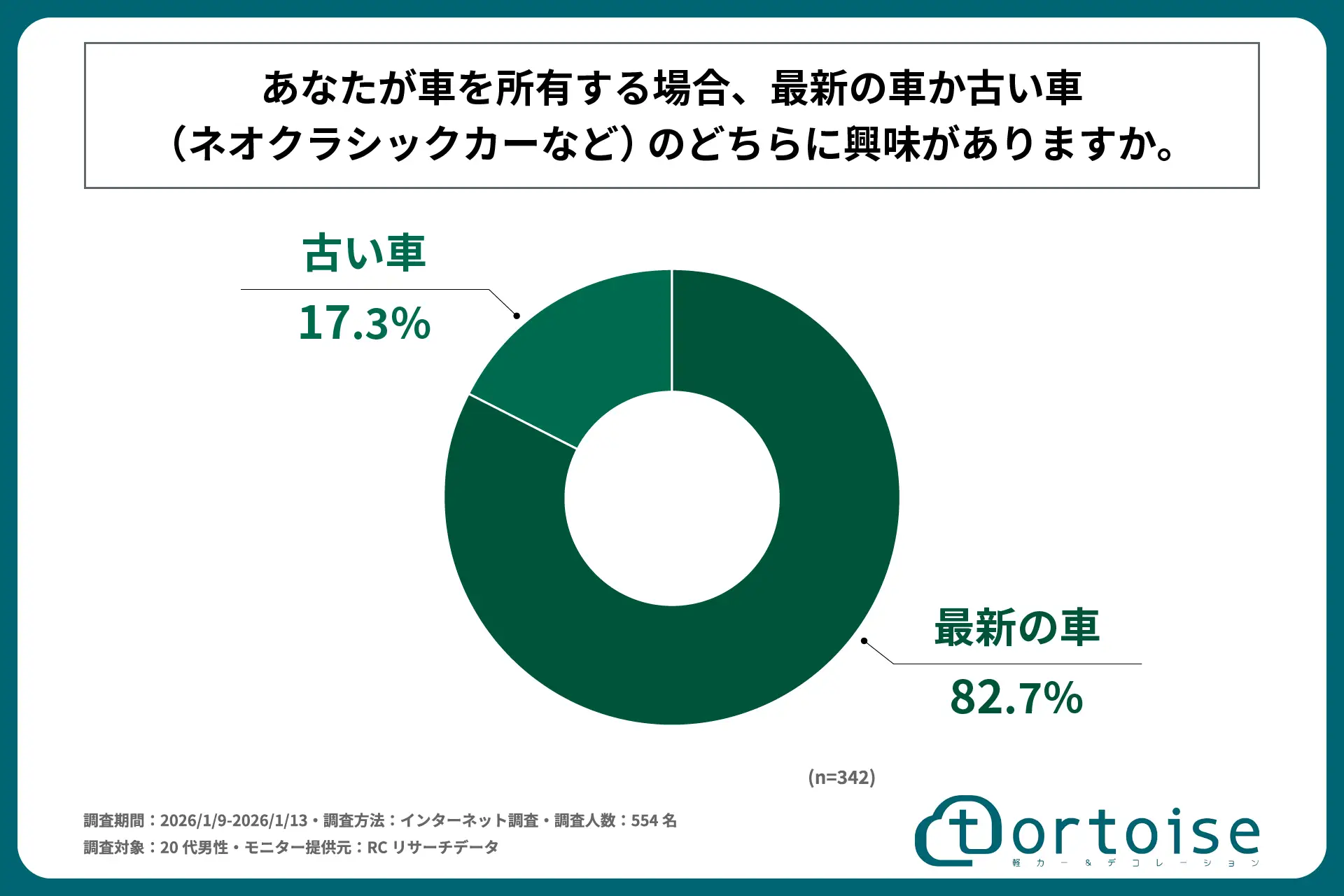 次に、将来的に車を所有したい20代男性を対象に「車を所有する場合、最新の車か古い車(ネオクラシックカーなど)のどちらに興味があるか」を尋ねる設問への回答では、「最新の車」が82.8%、「古い車」が17.3%という結果になりました。この結果から、車を所有したい20代男性の2割弱が、最新の車より「古い車(ネオクラシックカーなど)」に興味を持っていることが判明しました。