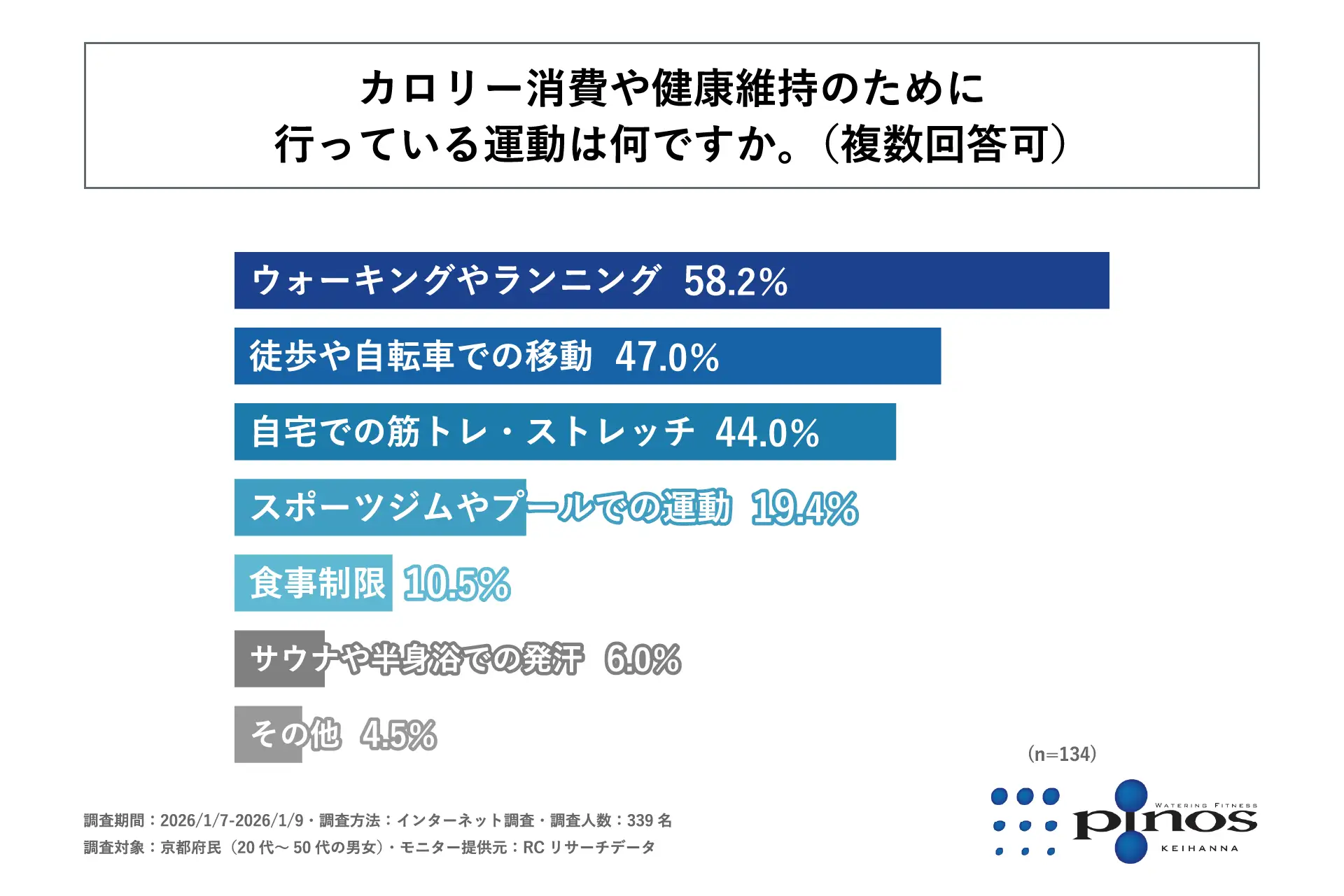 続いて、カロリー消費や健康維持のための運動習慣がある京都府民を対象に「カロリー消費や健康維持のために行っている運動は何であるか」を尋ねる設問への回答では、1位が「ウォーキングやランニング」で58.2%、2位が「徒歩や自転車での移動」で47.0%、3位が「自宅での筋トレ・ストレッチ」で44.0%という結果になりました。この結果から、カロリー消費や健康維持のための運動習慣がある京都府民の半数以上が行っている運動は、「ウォーキングやランニング」であることが判明しました。