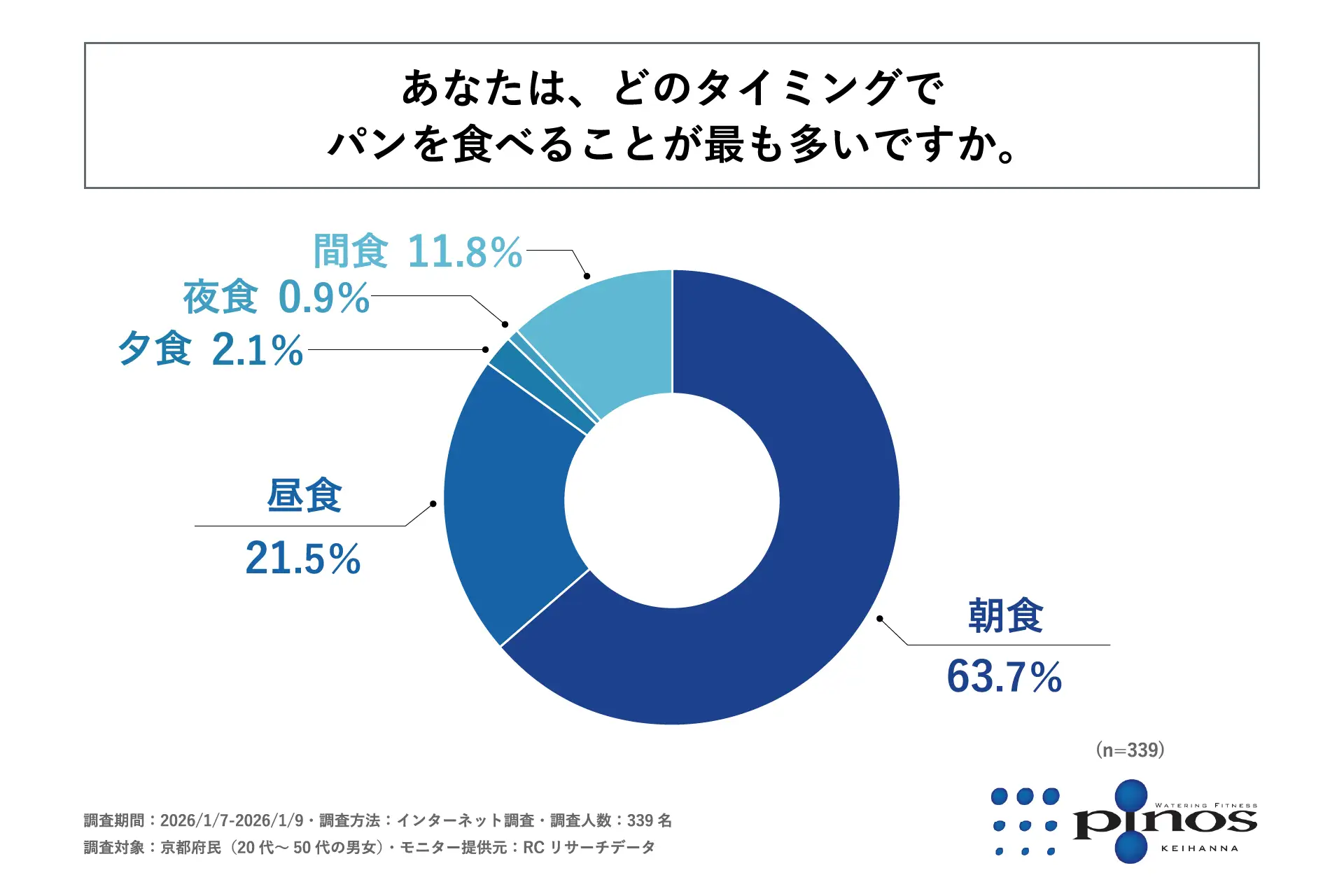 株式会社ピノス(本社:京都府京都市)が運営する「ピノスけいはんな店」は、京都府民(20代~50代の男女)を対象に「京都府民の”パンと健康”に関する実態調査」を実施しました。この調査から、京都府民のパンを食べる頻度やタイミング、パンを食べた後の健康への意識、健康維持のための運動習慣の実態などが明らかになりました。