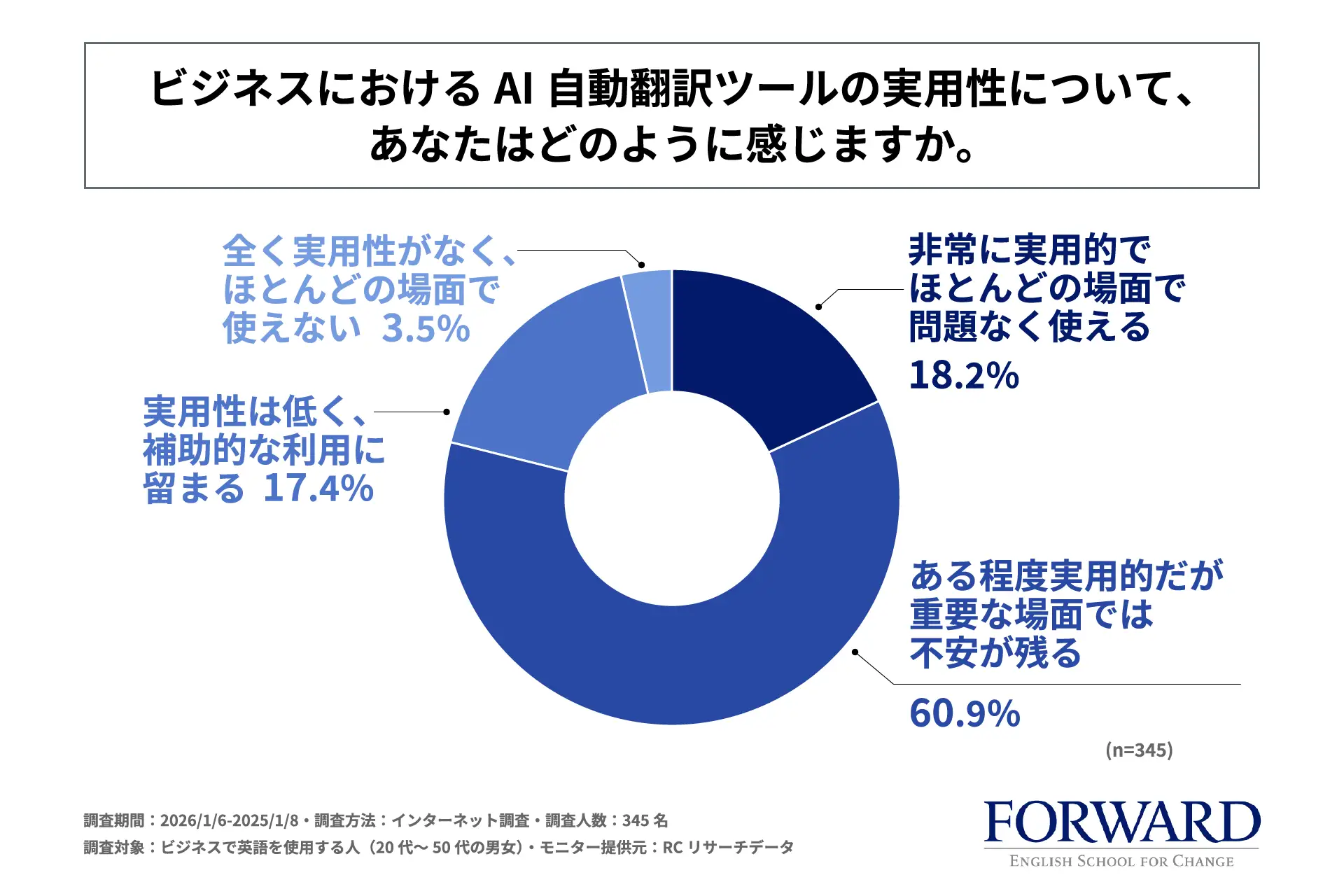ビジネスで英語を使用する人の6割以上が、ビジネスにおけるAI自動翻訳ツールの実用性について「ある程度実用的だが重要な場面では不安が残る」と感じている