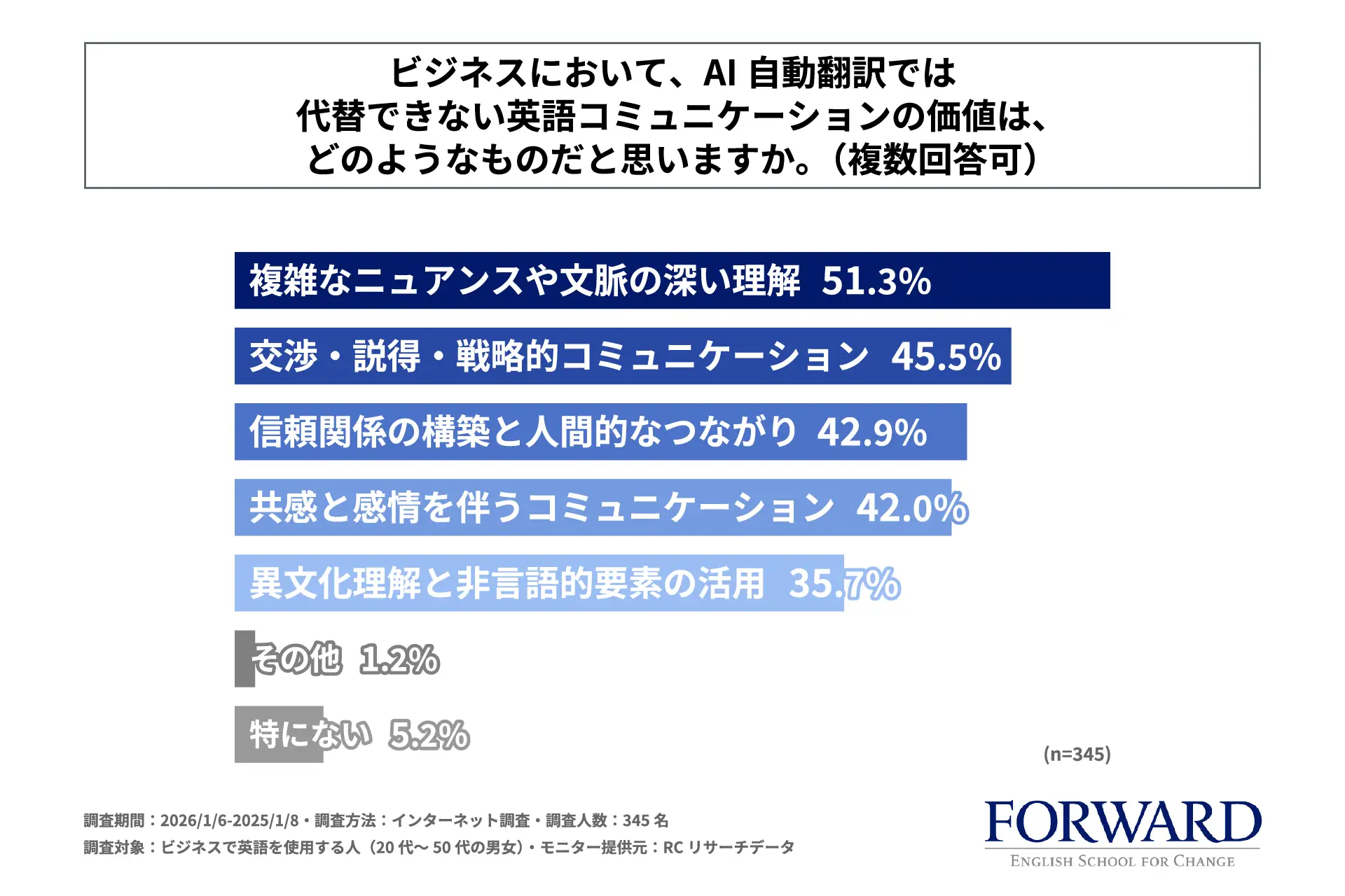 ビジネスで英語を使用する人の半数以上が、AI自動翻訳では代替できない英語コミュニケーションの価値は、「複雑なニュアンスや文脈の深い理解」にあると考えている