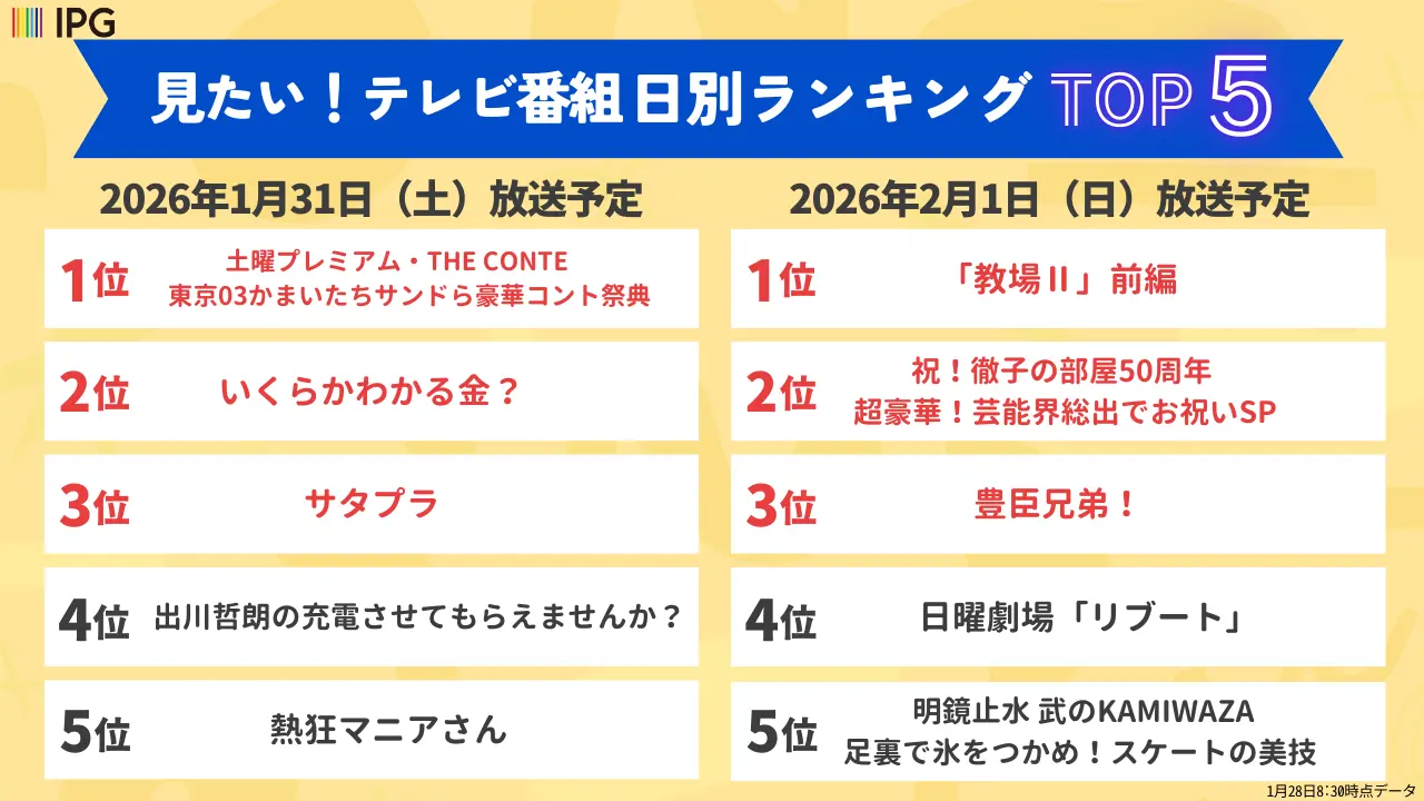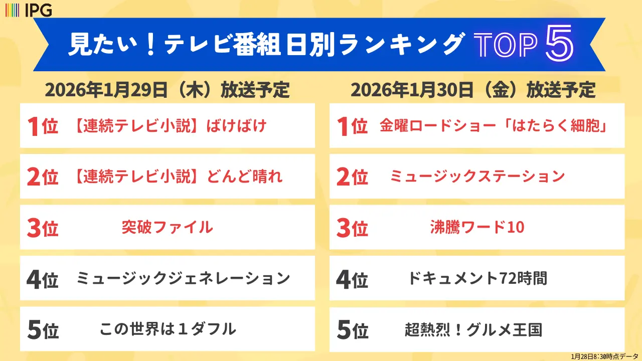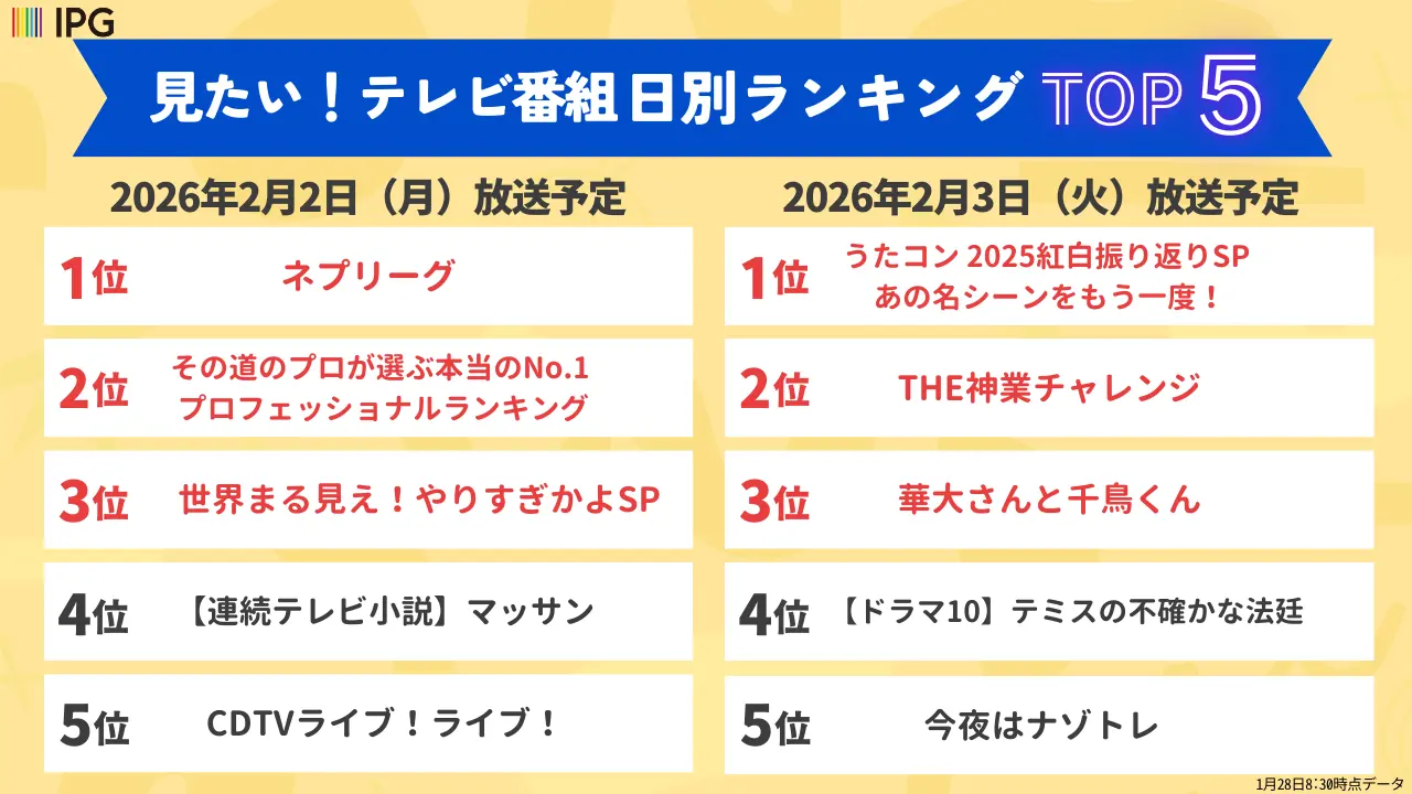 電子番組表「Gガイド」運営の株式会社IPGによる、今週放送予定のテレビ番組ランキングをご紹介します。
